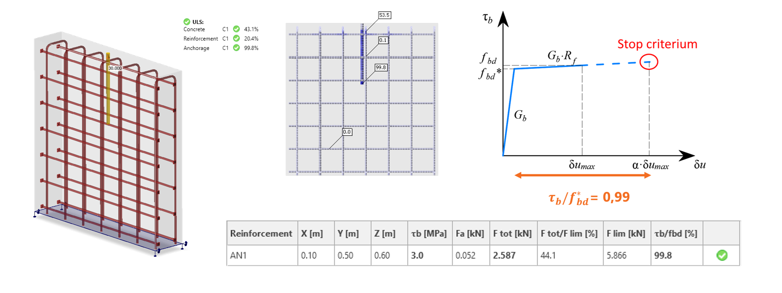 In most models, bond stress in anchorage exceeds 99,9% utilization for very low tension load levels. The reason can be found in the bond stress-strain diagram between the anchor/reinforcement and the concrete, as shown in the figure below. The bond reaches its ultimate stress rapidly, and any further loading leads to plastic deformation of the bond. To determine the ultimate bond stress for the adhesive anchors, see the article Bond strength for anchors in Detail 3D.