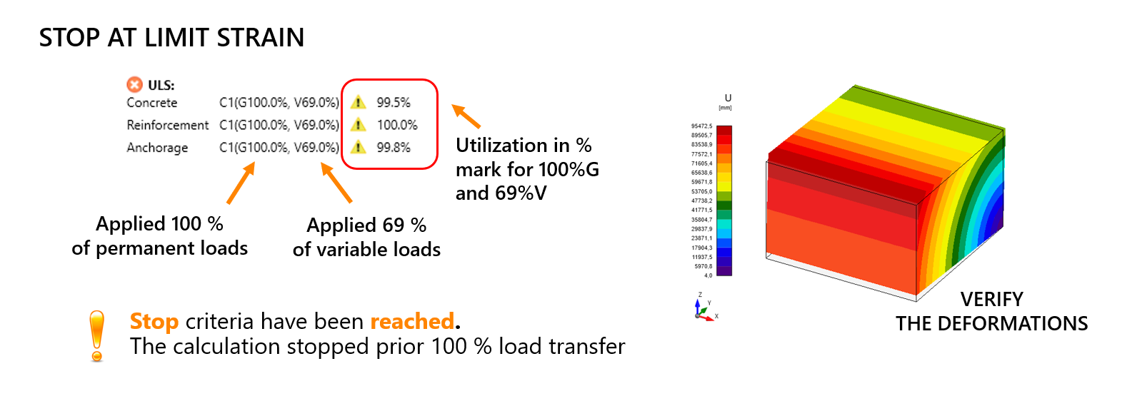 The stop criteria in the 3D CSFM model ensure simulations halt at defined limits, see Solution method and load-control algorithm for 3D CSFM in the theoretical background for IDEA StatiCa Detail. By default, the "Stop at Limit Strain" option is active, stopping calculations when some of ULS criteria are reached. Utilization is checked for concrete, reinforcement, and anchorage. Concrete strain is limited to 5 % in compression and 7 % in tension due to convergence needs. Rebar plastic strain is capped at 5 %, while anchorage uses slip-based limits, not bond stress. This could be caused by several reasons. The most common reason is missing reinforcement. Divergence errors may also arise from an improperly supported model, leading to excessive deformation. Another reason can be that the design is not satisfying for the specified load and is simply overloaded.