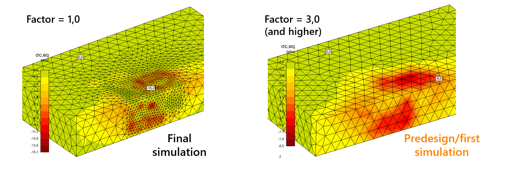 Mesh quality is crucial for 3D simulations, especially for nonlinear problems, as it directly impacts calculation time. The mesh multiplier ranges from 0.5 to 5, with 1 being the default. Using a factor of 5 speeds up simulations, helping identify errors, but results may be inaccurate (over 30% error). After verifying the model, the suggested factor is 1 or lower for accurate stress and strain, which increases analysis time. A coarse mesh (higher factor) is used for predesign, while a finer mesh (lower factor) provides more accurate results in the final simulation, especially around anchors.