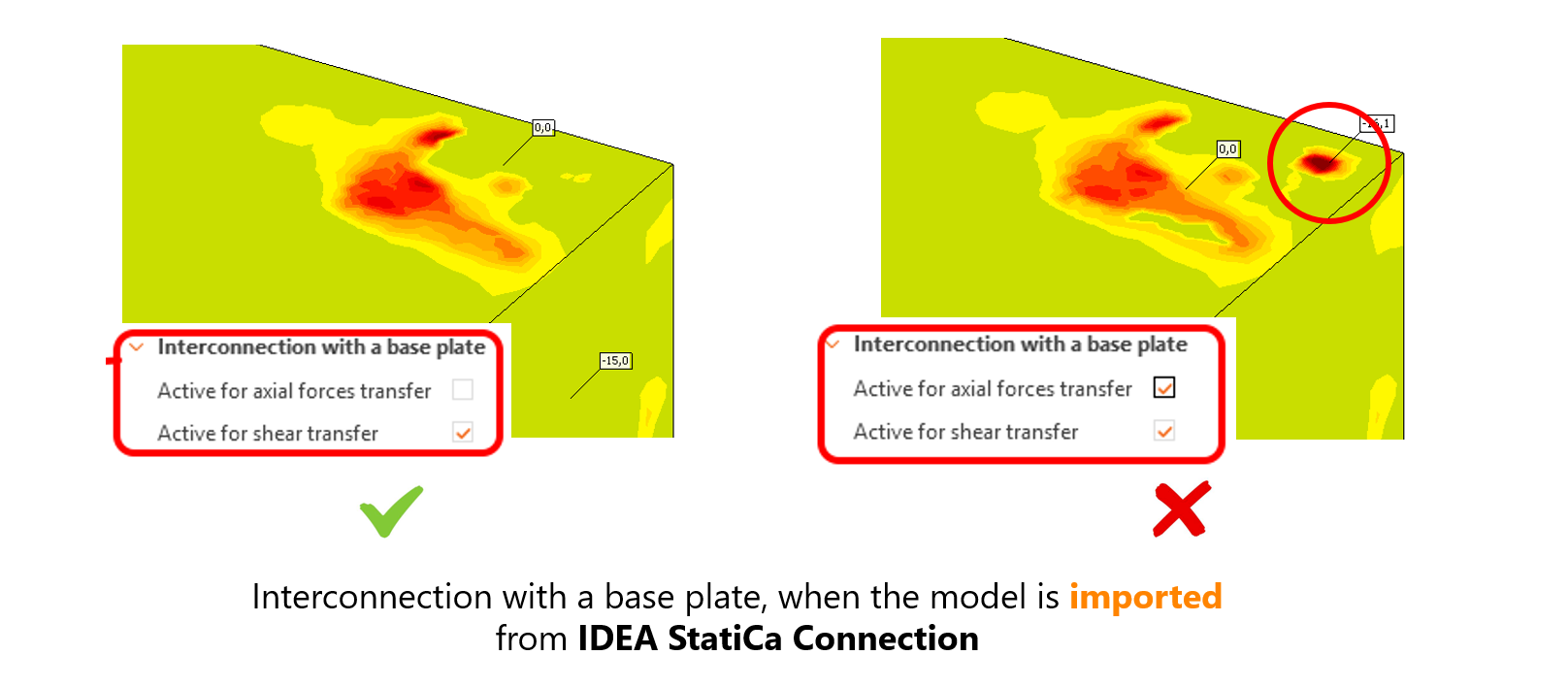 • When exporting the anchoring model from IDEA StatiCa Connection (e.g., see BIM link Connection to Detail - Eccentrically loaded anchoring), axial force transfer between anchors and the base plate is turned off to avoid unwanted additional prying of the base plate.