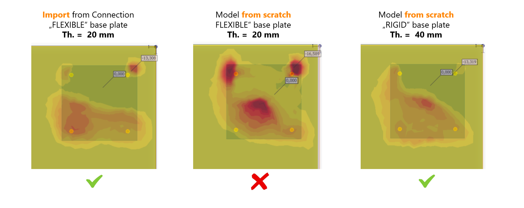 • Imported loads are not in equilibrium, and the model can not be calculated because of huge base plate deformations and analysis divergence.