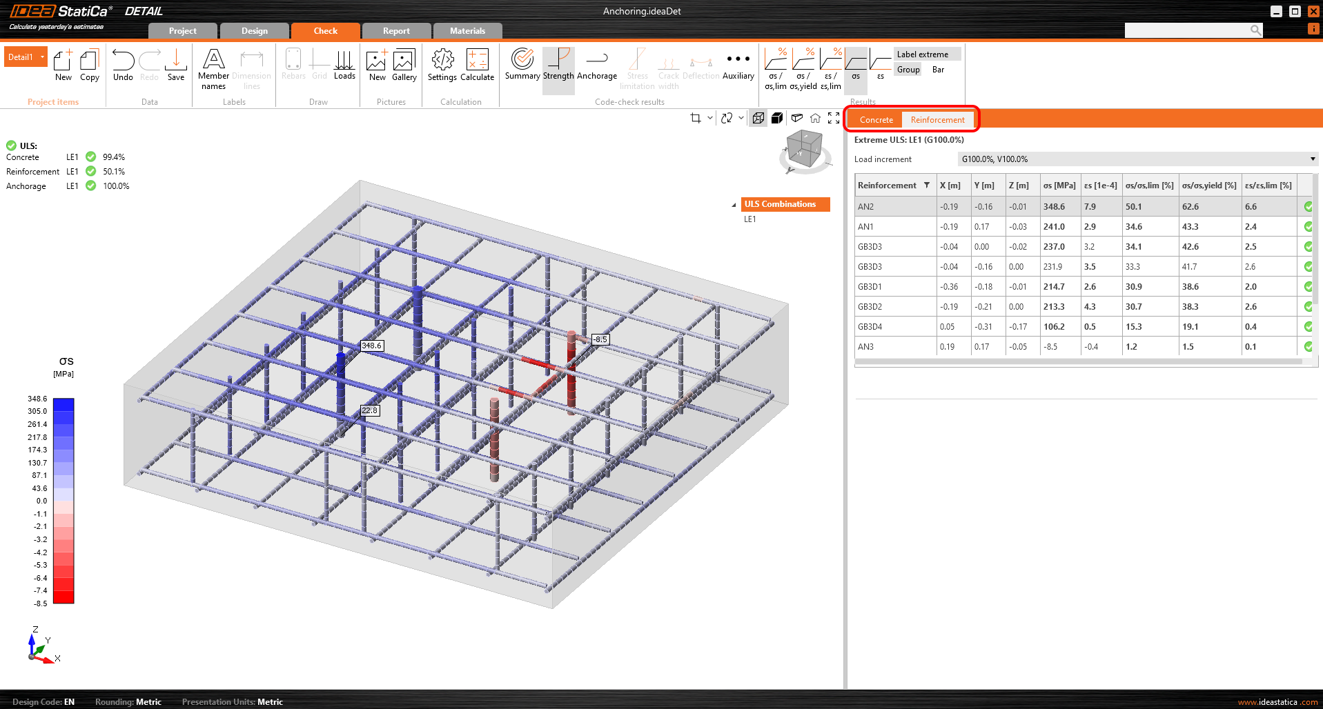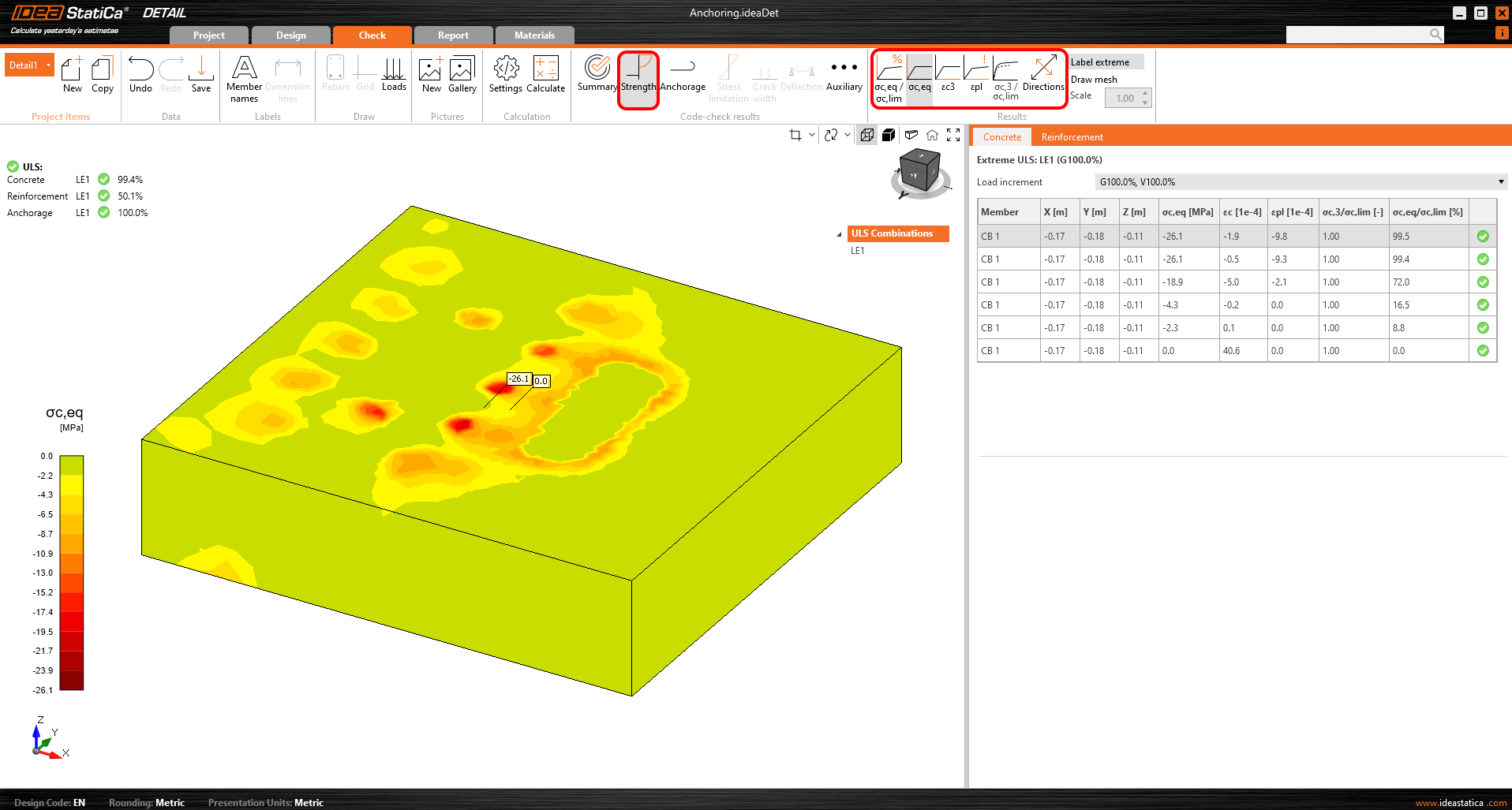 The display of the results is very similar to 2D Detail. However, there are some major differences, especially when it comes to results on concrete. In the following section, we will go through all the available results, focusing on the differences mentioned. In the check tab you can view a total of 4 types of results:
