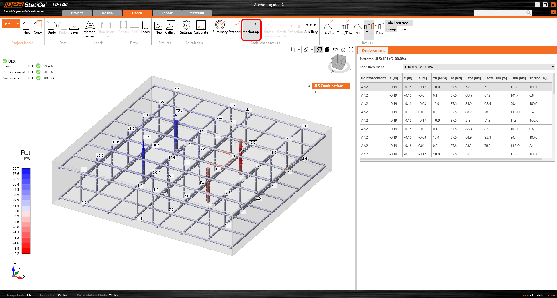 Anchorage check gives you information about bond stress and total force on the reinforcement and anchors.