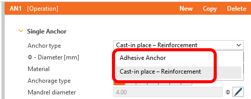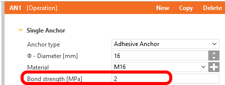 For Adhesive anchor, there is another parameter coming into the analysis – Bond strength. This value is set by default to 2 MPa and should be adjusted by the user according to the datasheet info from the anchor manufacturer.