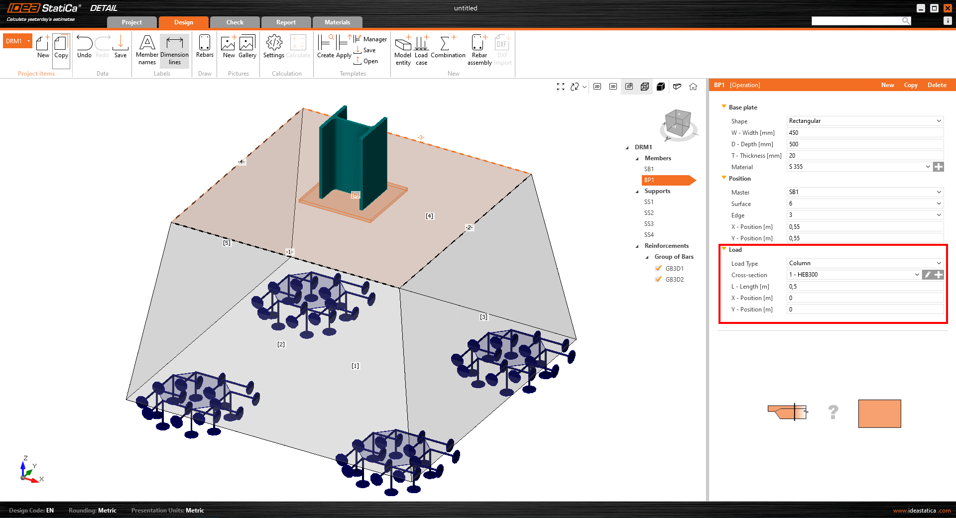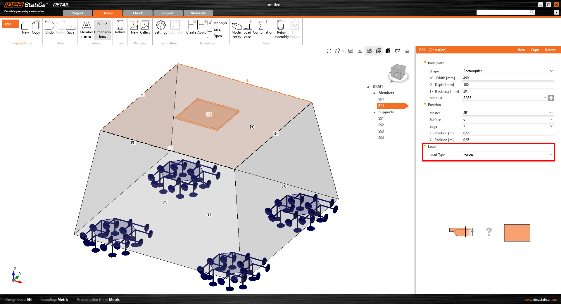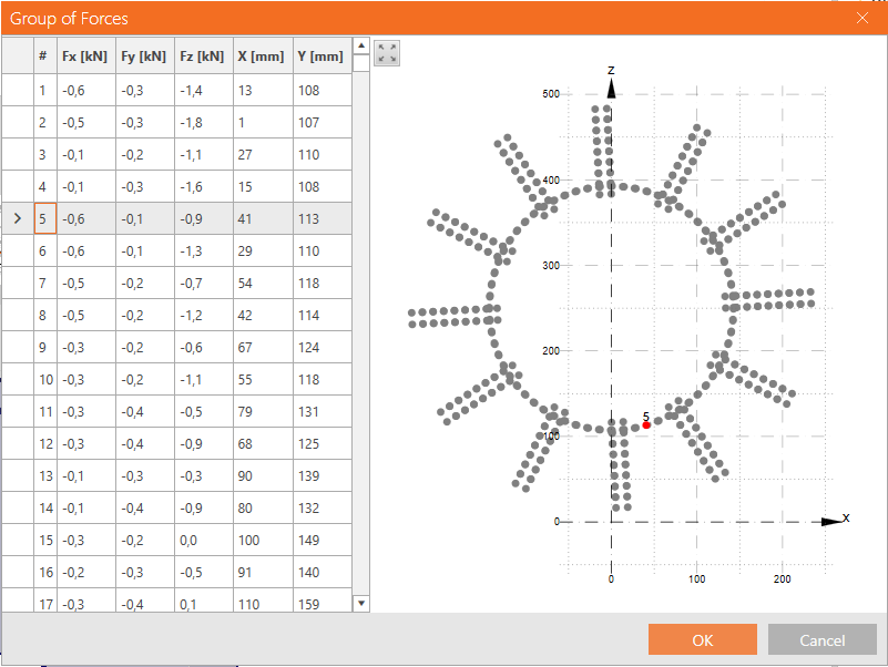 - Group of forces – A group of forces is an entity that defines several point loads acting as a group. It can be applied on the base plate or the concrete surface. This load type can be used to simulate forces in welds transferring stresses from the column to the base plate.