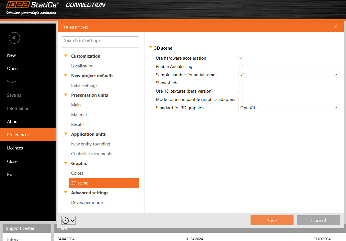 The 3D presentation depends on both, hardware and software. Unfortunately, it is not possible to suggest one setting for high performance and another for beautiful screenshots. Processor performance, graphics card performance, producer and drivers – they all affect the resulting performance of 3D window in IDEA StatiCa.