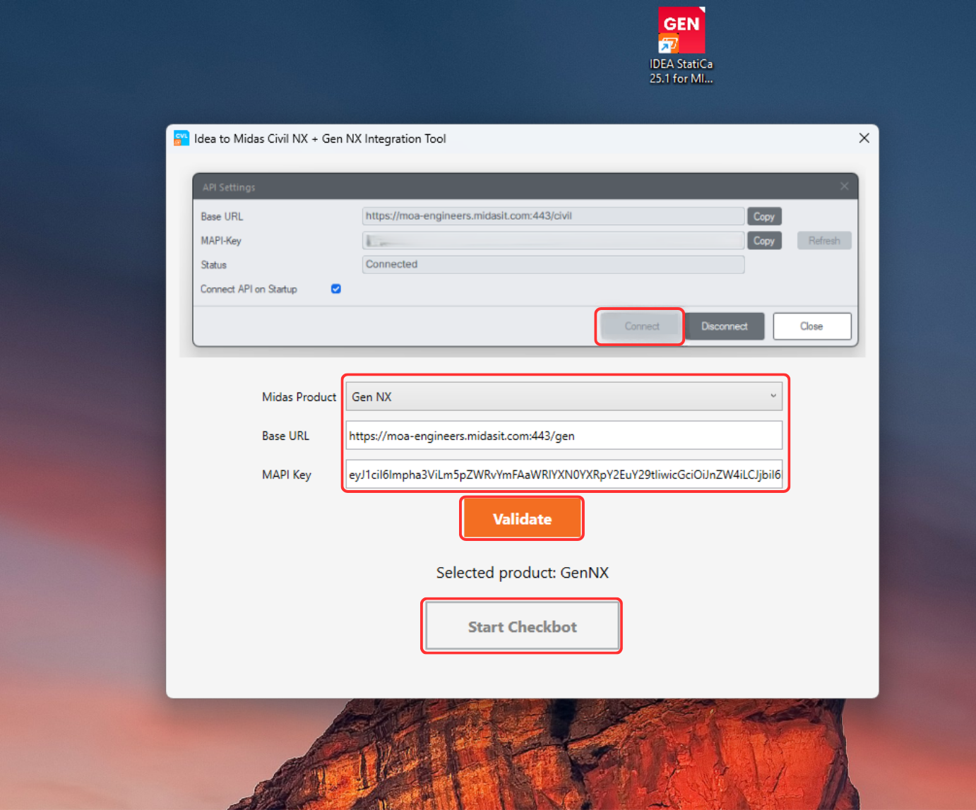 Open the IDEA to MIDAS GEN NX Integration Tool from the Desktop and paste the copied Base URL and MAPI Key from your opened MIDAS GEN NX project (1). Then, Validate (2) and connect to GEN NX (3). After that, Start Checkbot (4).