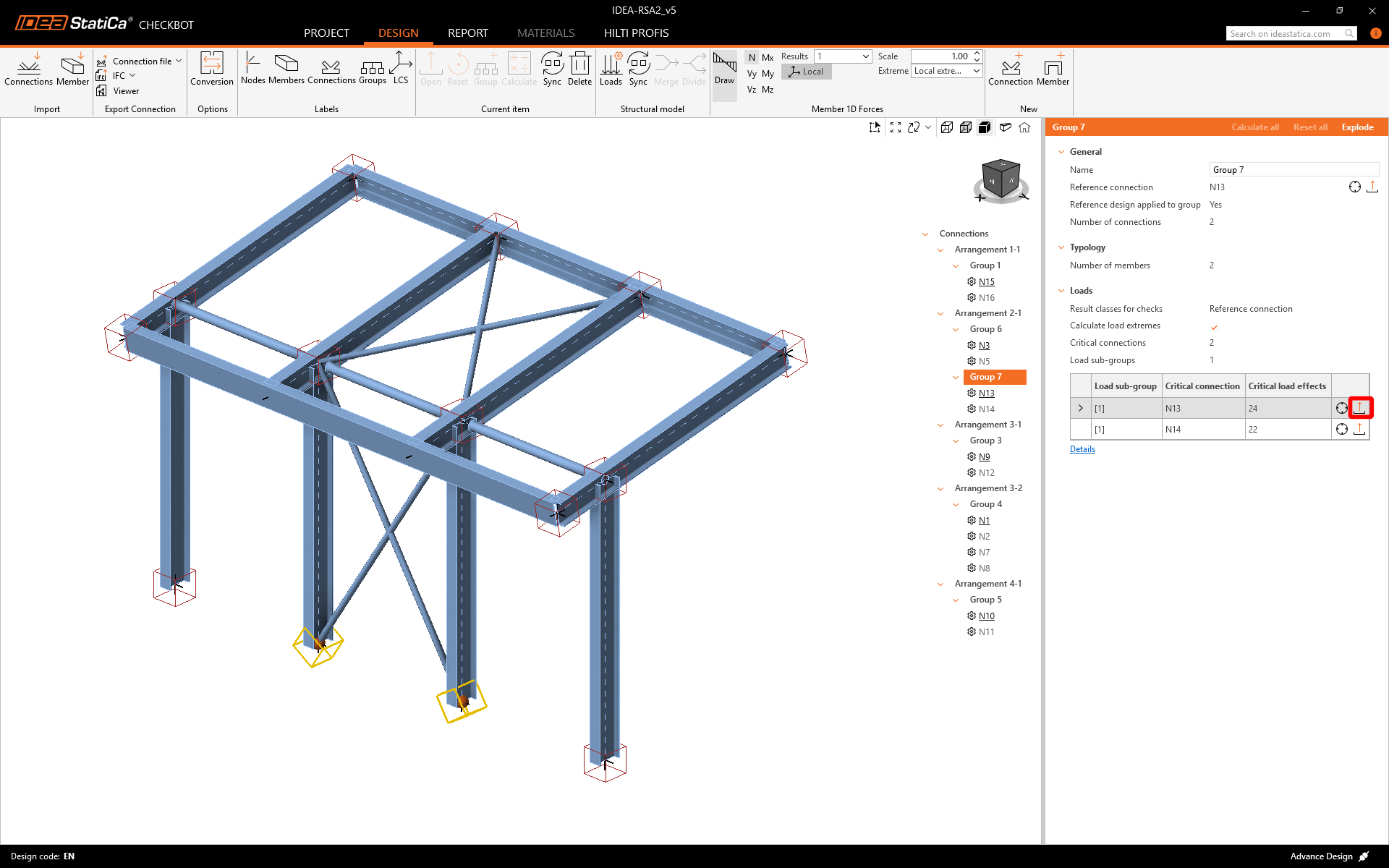Now you can assign correct Result class to designed connection and activate Calculate load extremes for group. This allows you to design and check the connections only for Critical load effects.