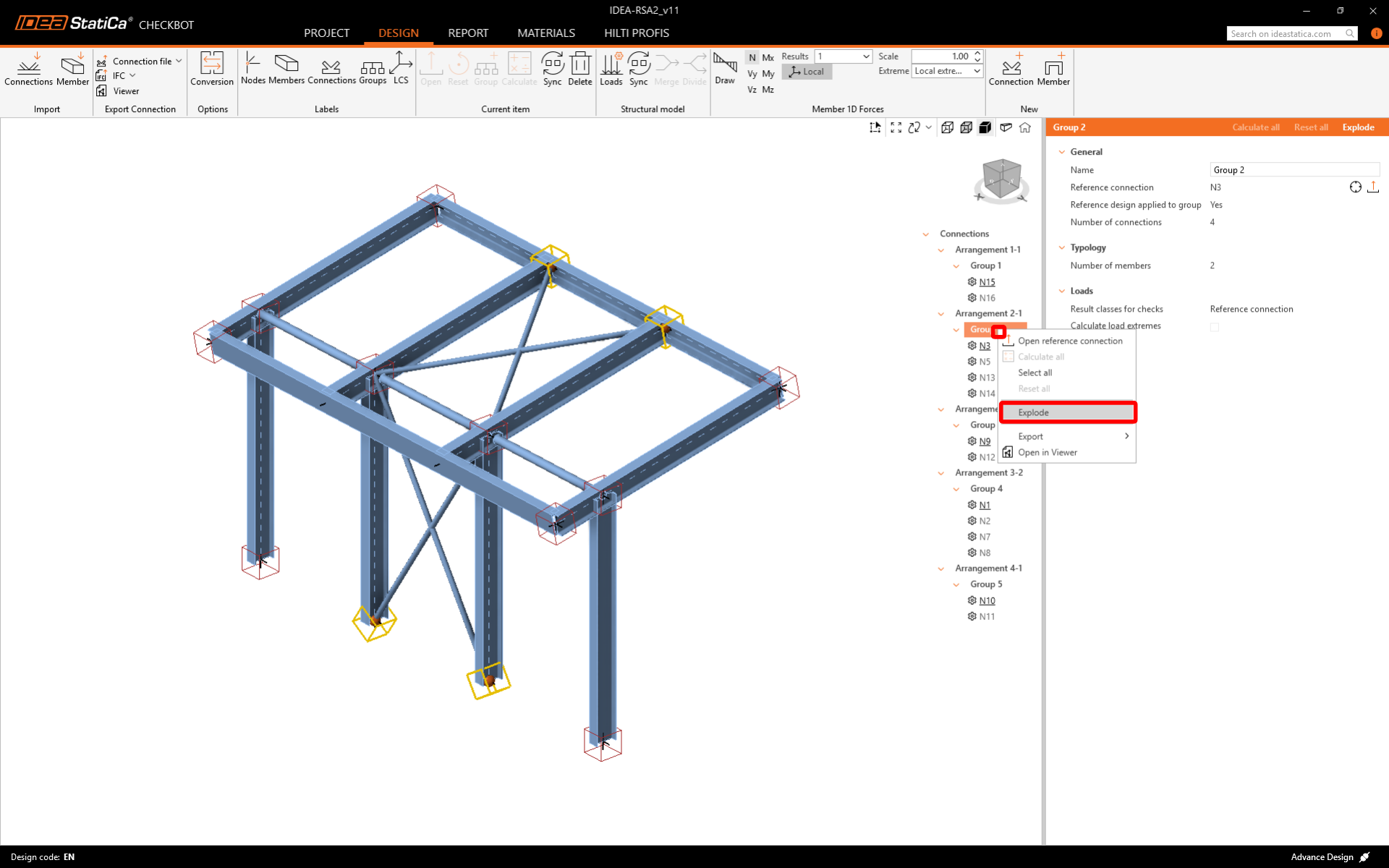 The grouping functionality automatically creates groups of connections based on typology and/or cross-sections. Every group is represented by the reference connection (underlined in the tree), which is automatically designated as the parent connection that drives the design for the whole group. All other connections are treated as child connections. If the groups aren´t created correctly, like in this case, you can Explode them and create new ones.