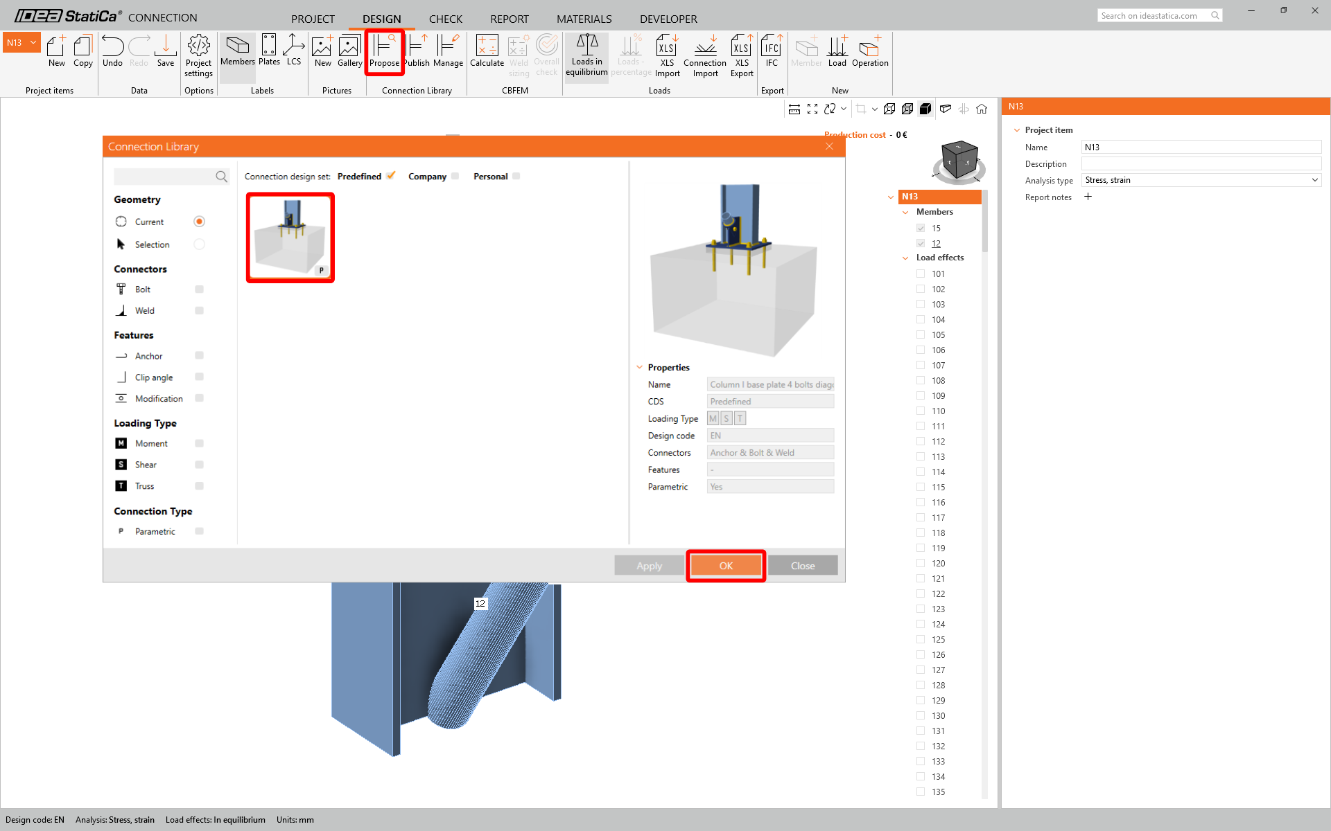 In this tutorial we are going to use the Connection Library to generate a connection. Select Propose and IDEA StatiCa will put forward possible solutions for the current geometry.