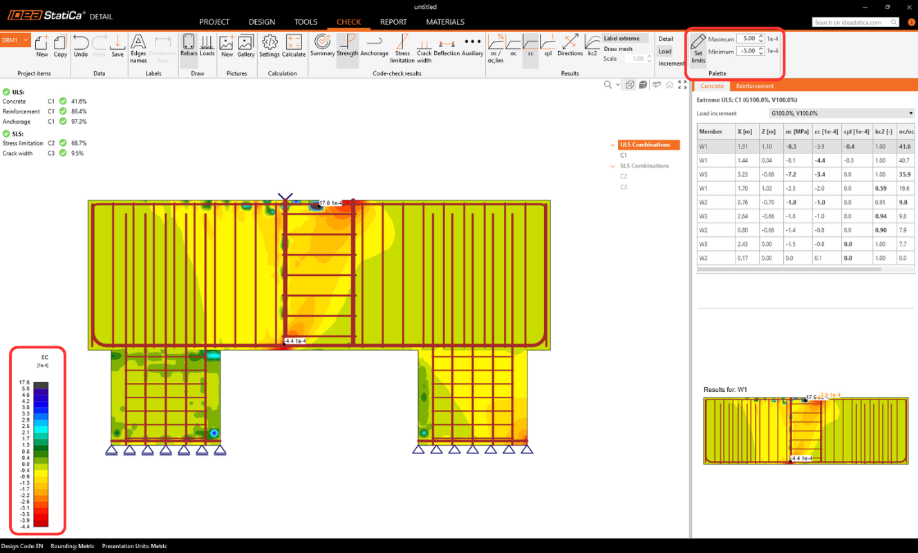 In the main ribbon, it is also possible to set custom limits for the color palette used to display results. This is particularly useful in cases where peaks with concentrated stresses occur, which would otherwise make it difficult to read the results and see the stresses in the rest of the structure.