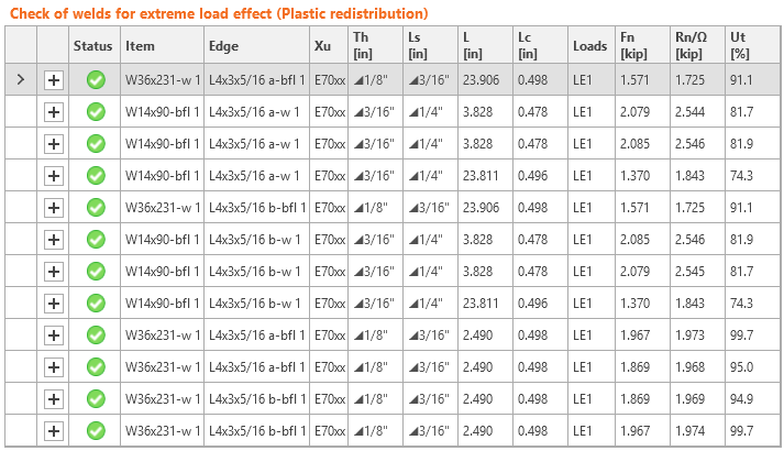 The results of both IDEA StatiCa and calculation according to AISC Design examples gives nearly identical values: 228 kips (LRFD) and 158 kips (ASD) in IDEA StatiCa and 229 kips (LRFD) and 153 kips (ASD) in AISC Design Example. The assessment in IDEA StatiCa slightly depends on the position of the shear force. The position near the center of gravity of the angle cross-section was selected.
