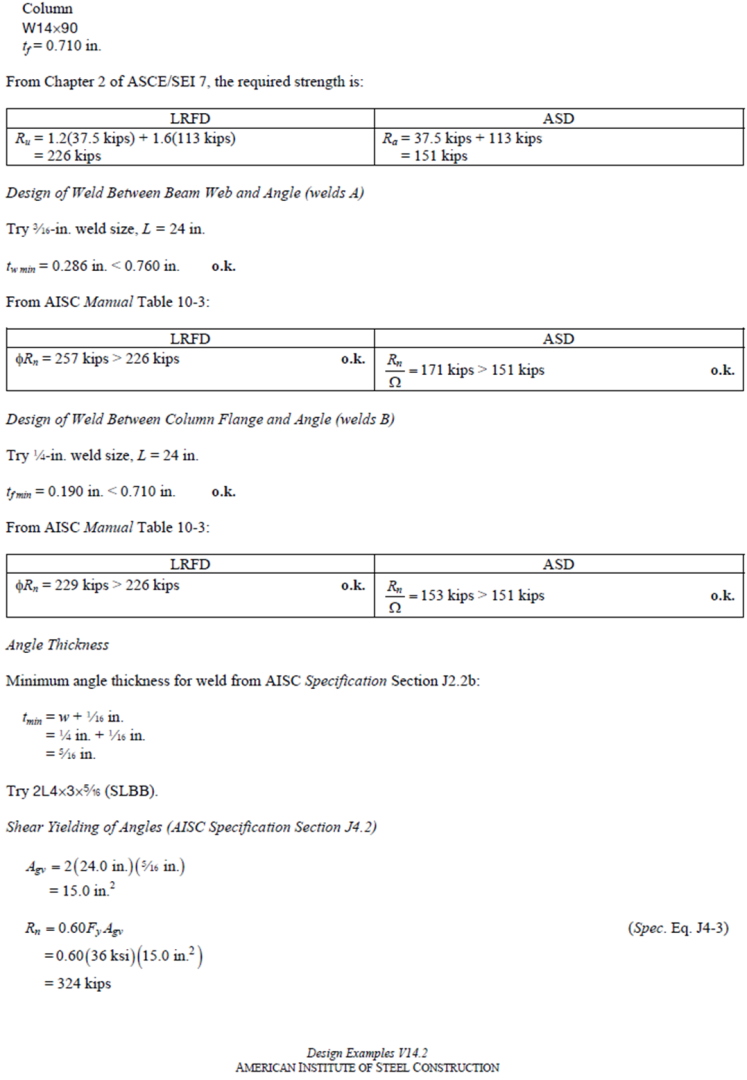 The example is taken from AISC Design examples (Version 14.2, revised in April 2016) – Example II.A 3 All welded double-angle connection.