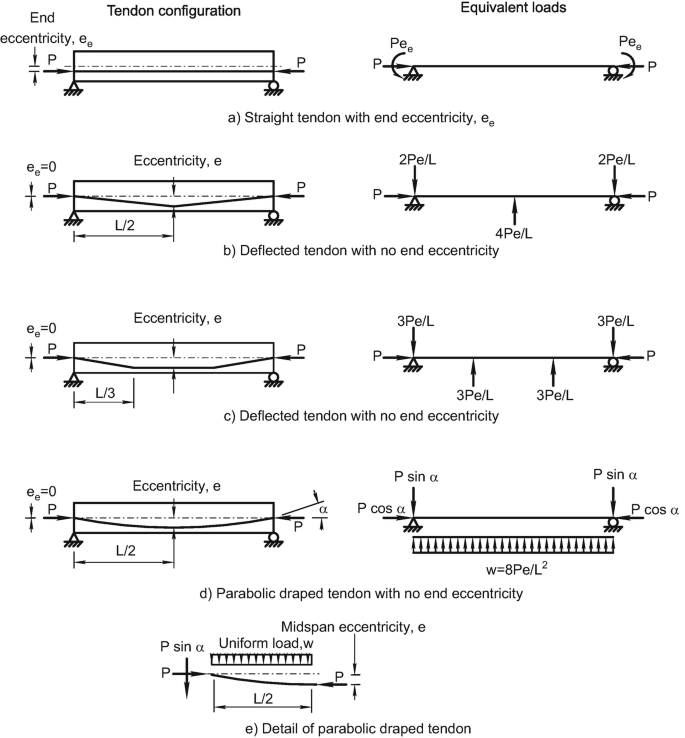 In this method, all forces acting on the concrete member by the prestressing tendon are determined and used to evaluate the prestressing effects on the beam. These forces are expressed as equivalent loads and occur at the anchorage points and at the points where the cable changes direction.