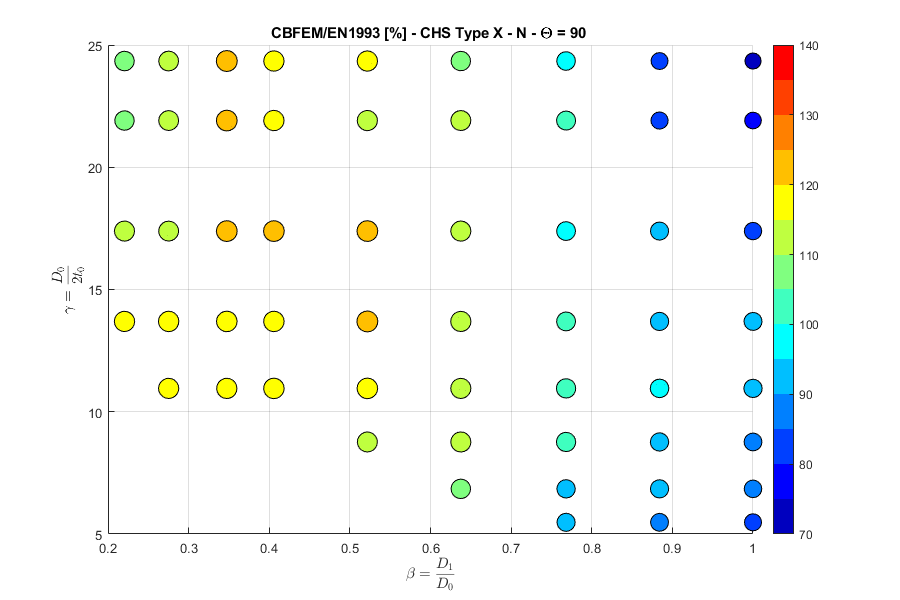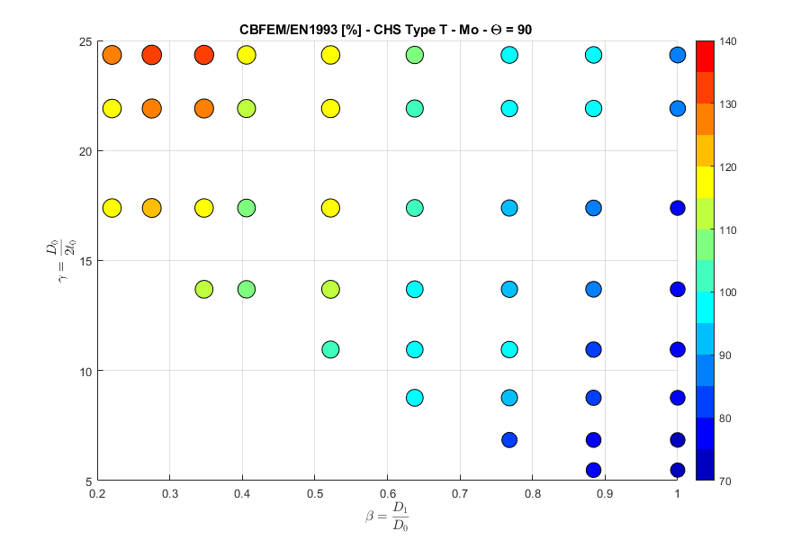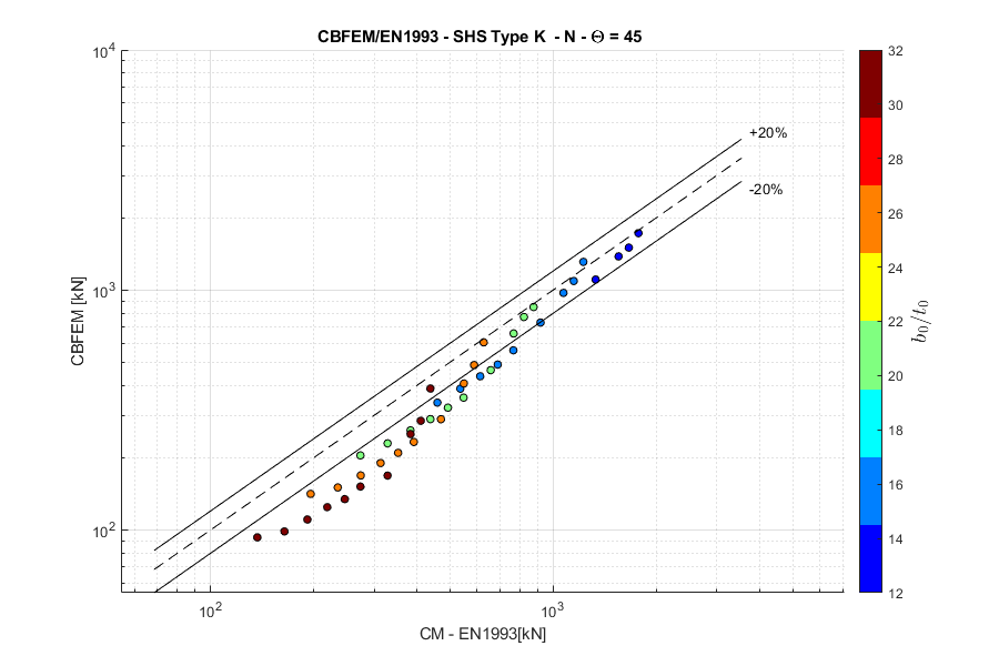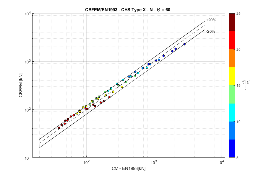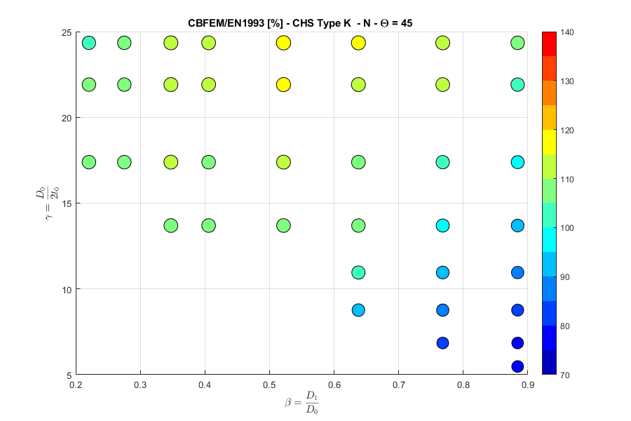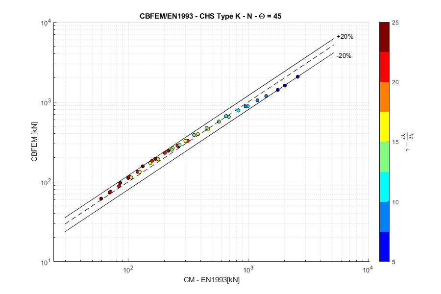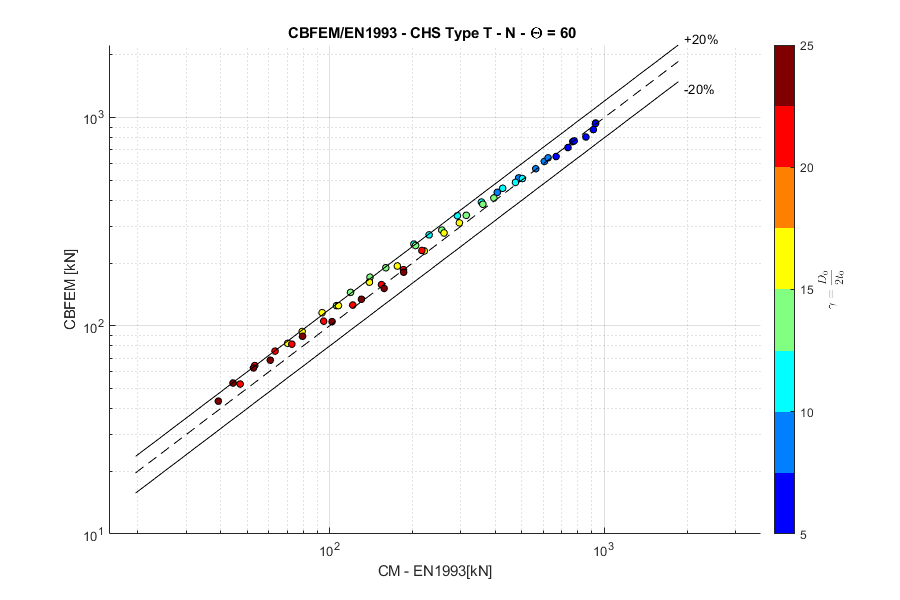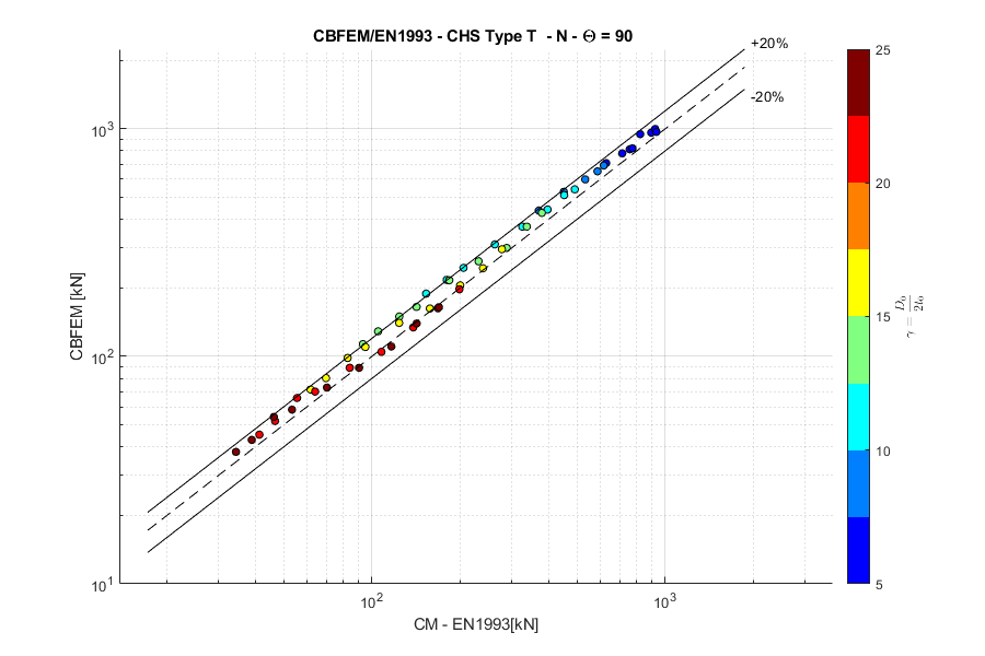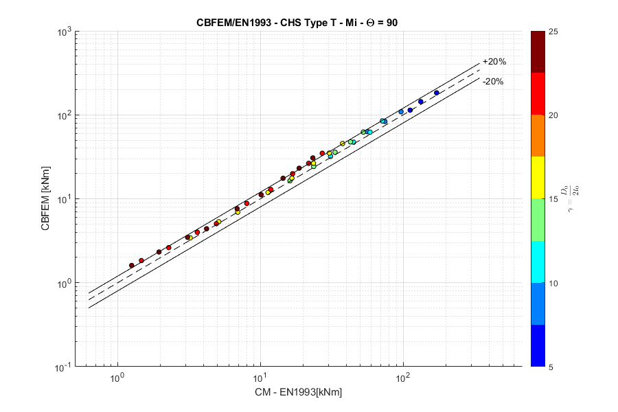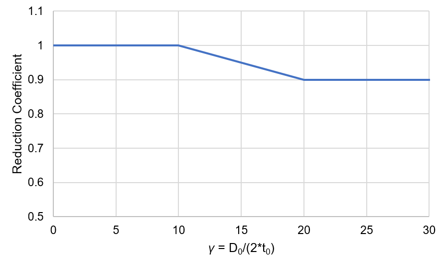 Load resistances of hollow section joints in the codes are determined by the Failure Mode Method that uses curve-fitting models determined from experiments and advanced numerical models. This design method is implemented in all codes. At the moment, the most recent state-of-the-art is in a draft of prEN 1993-1-8:2022. The real structure contains initial imperfections and residual stresses, which are not captured by shell models in IDEA StatiCa Connection. To achieve closer compliance with the results of codes, the influence of residual stress and initial imperfections was introduced in IDEA StatiCa models by reducing the bending resistance of shells of hollow sections with a high D/(2t) ratio. This allows to reduce the resistance of failure modes of joints but keep the normal and bending resistance of hollow section members. The reduction in plastic resistance of shell elements depends on the factor \(\gamma = \frac{D_0}{2t_0}\):