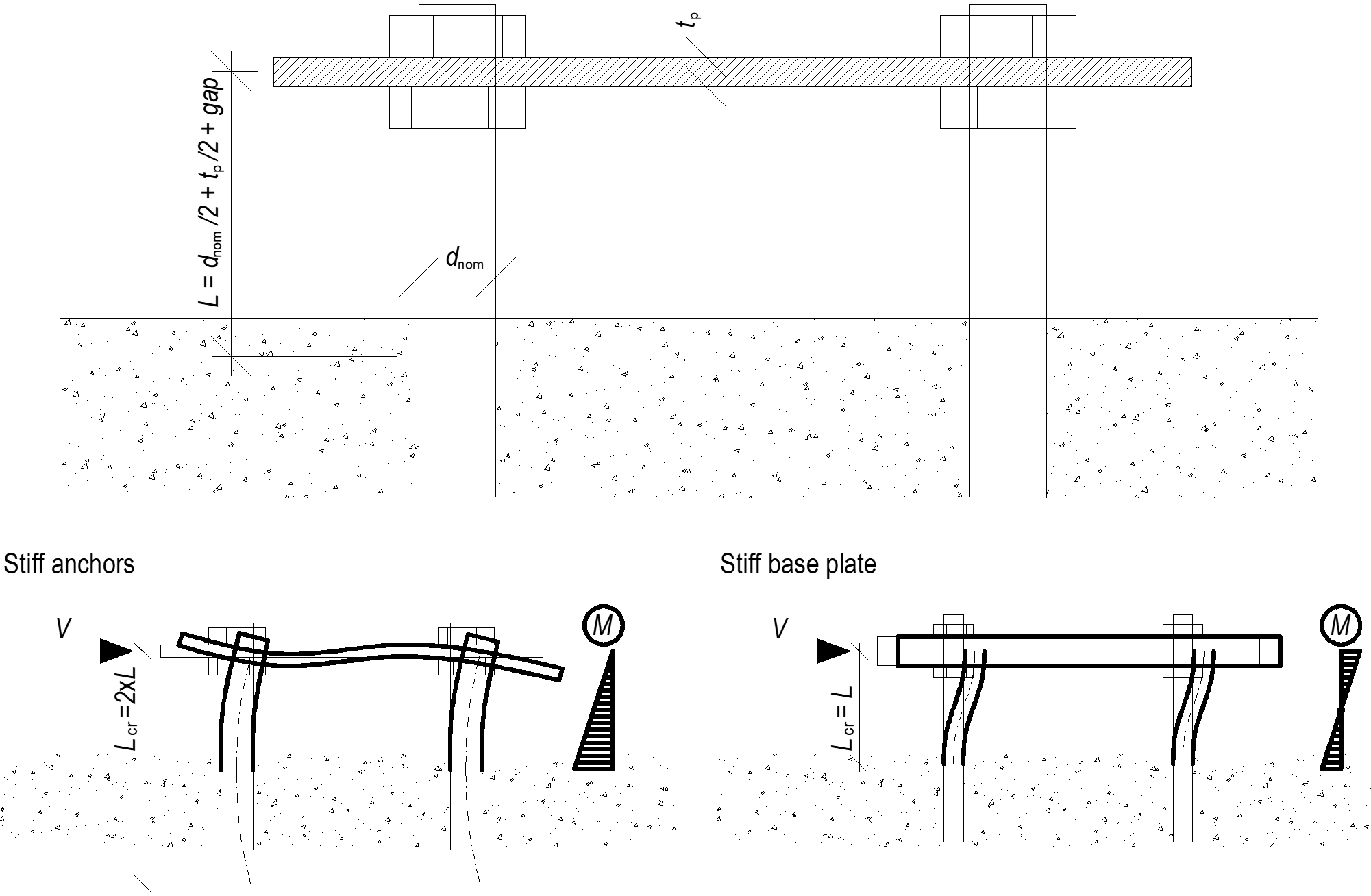 Anchors with stand-off can be checked as a construction stage before the column base is grouted or as a permanent state. Anchor with stand-off is designed as a bar element loaded by shear force, bending moment, and compressive or tensile force. The anchor is fixed on both sides; one side is 0.5×d below the concrete level, the other side is in the middle of the thickness of the plate. The buckling length is conservatively assumed as twice the length of the bar element. Plastic section modulus is used. The forces in anchor with stand-off are determined using finite element analysis. The bending moment is dependent on the stiffness ratio of anchors and base plate.