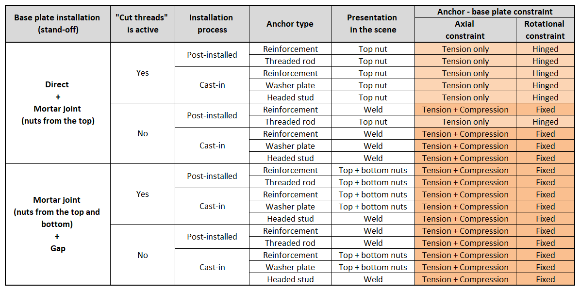 Below is a summary table explaining axial and rotational constraints between the base plate and the anchor.