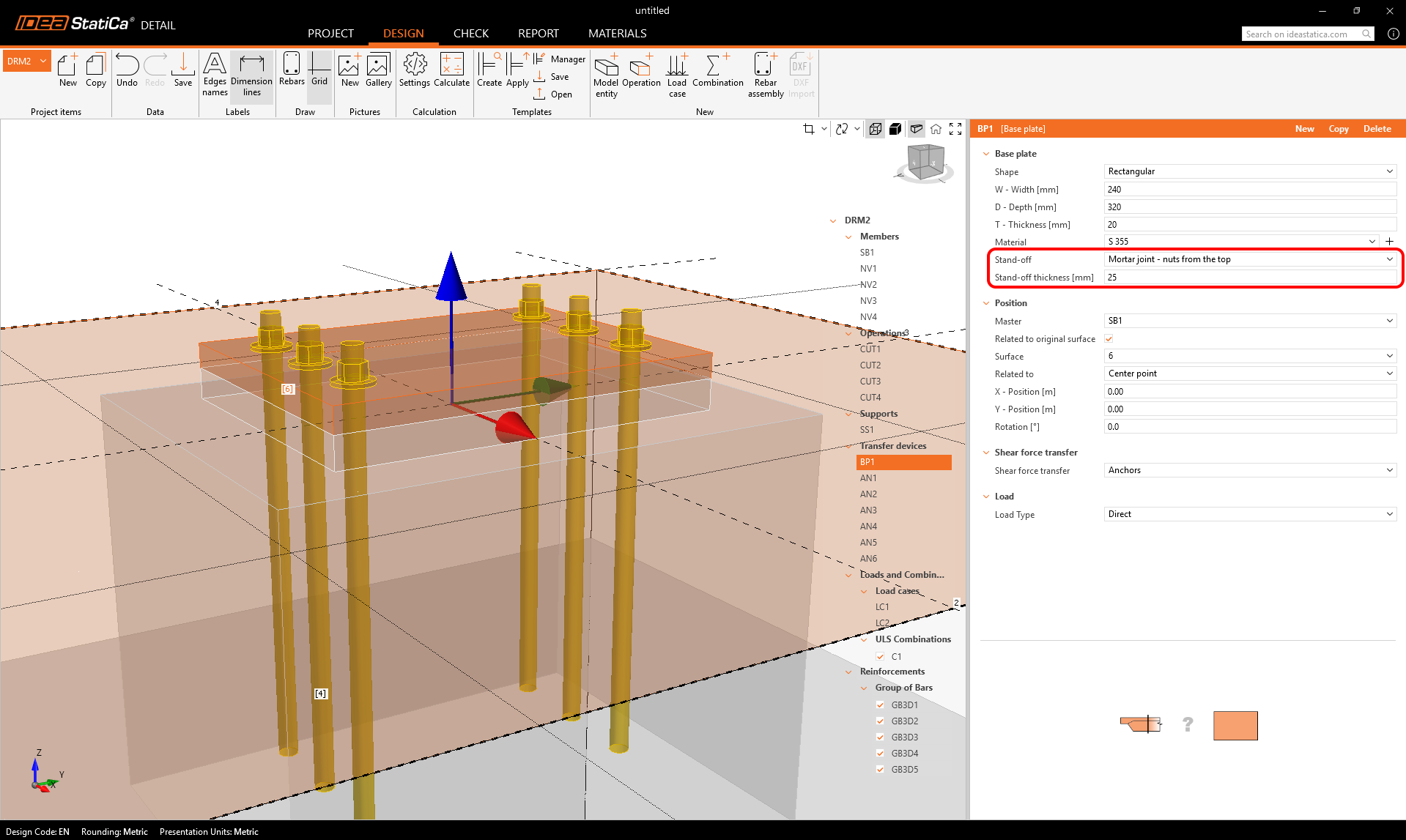 - Gap: a vertical clearance under the plate can be specified. Anchors are then directly loaded, with no contact between the plate and concrete.