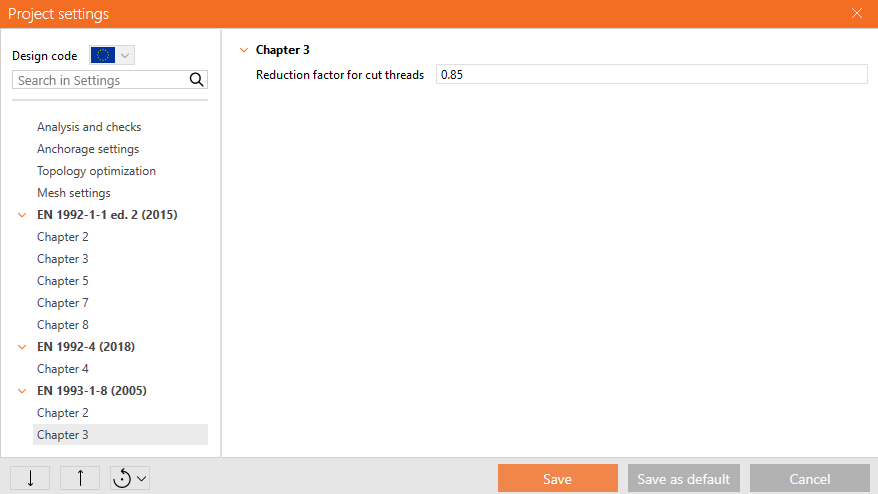 For EN, the resistance of the anchor with cut threads is reduced according to EN 1993-1-8 3.6.1 (3). It can be set in Project settings.