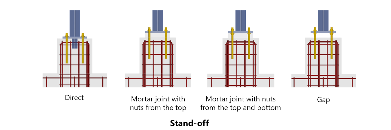 Here is an overview of common stand-off scenarios, including mortar joint, nuts, and gaps. Further in the article, you can find an explanation of the Cut thread function, which, when used correctly, can help you achieve an accurate representation of hinged versus fixed anchor–plate behavior. The feature enhances physical accuracy without compromising calculation efficiency.