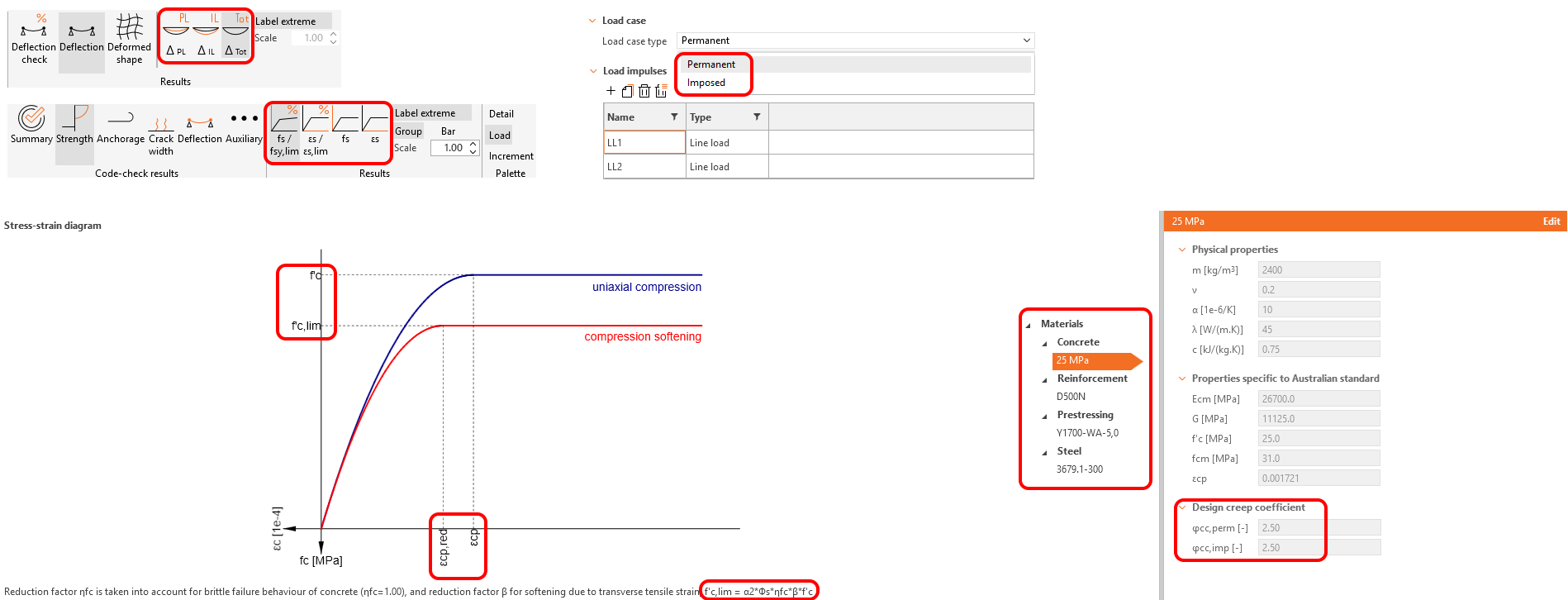 - Stress-strain diagrams for serviceability and strength, incorporating long-term effects using the design creep factor.