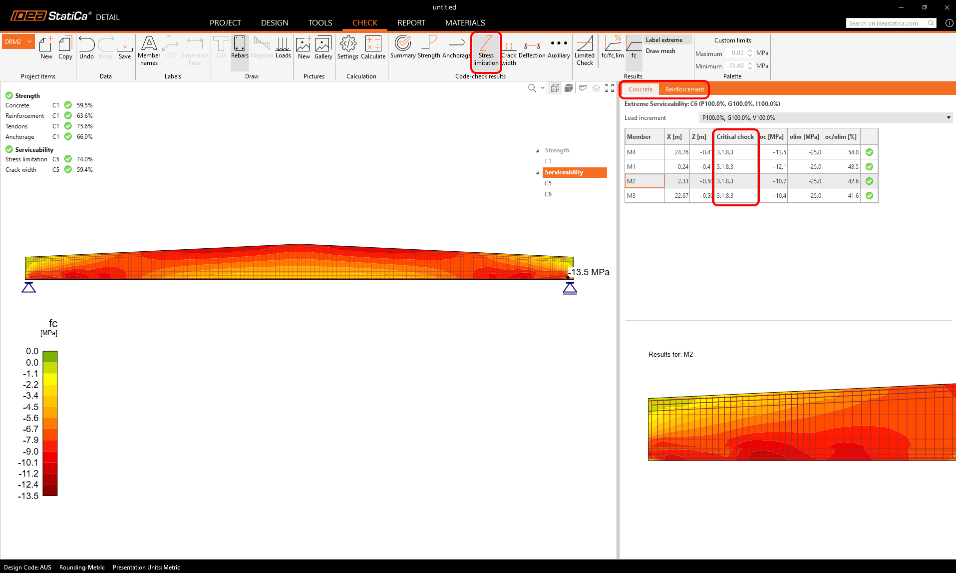 All relevant verification checks are available, including strength, anchorage, stress limitations, and crack width, in full compliance with AS 3600.