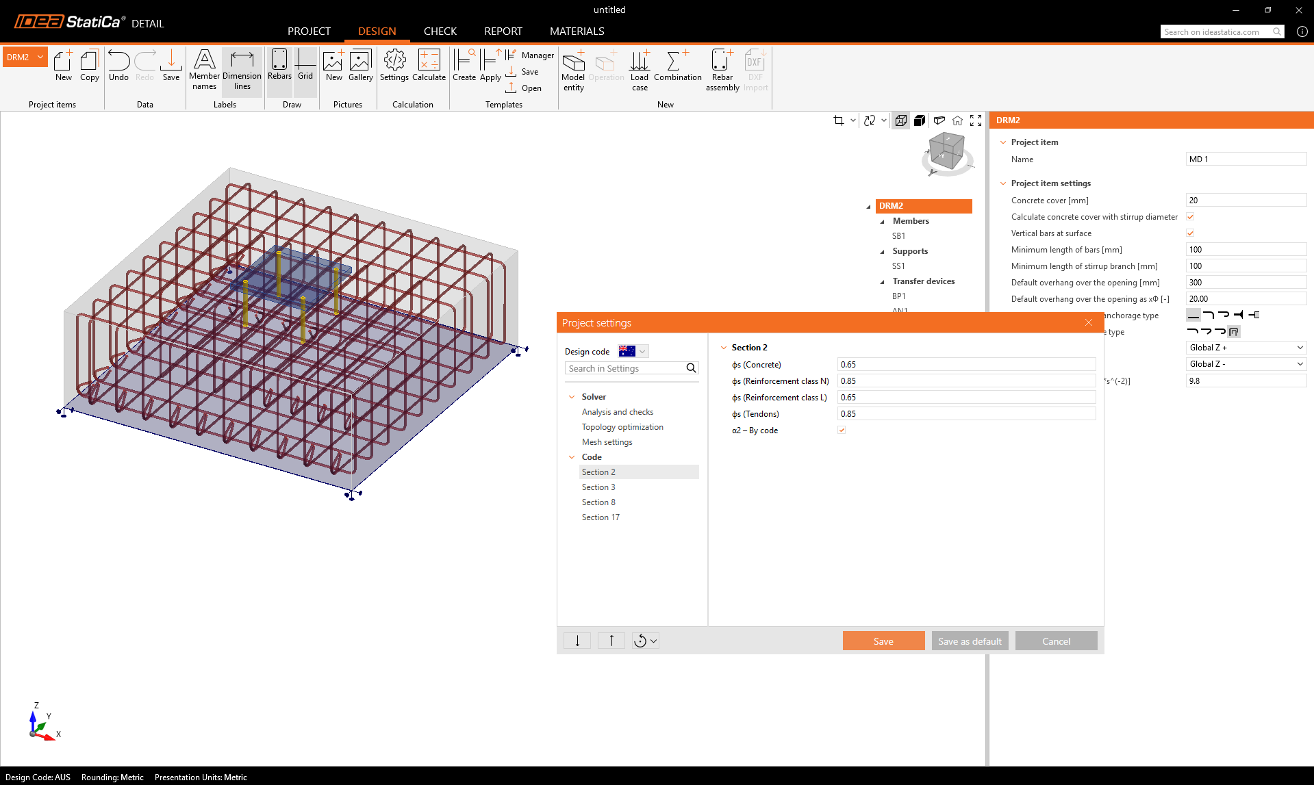 Users can utilize the full functionality of Detail (in 2D), adapted to AS 3600 terminology, material properties, and verification checks. The user interface aligns with Australian standards, making the design process more intuitive and ensuring that calculations follow local industry requirements.