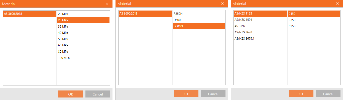 - Material Database – A built-in database includes concrete, reinforcement, and steel materials defined by AS 3600.