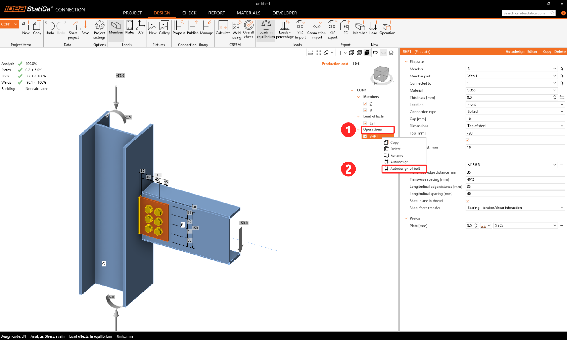 Once your bolted connection has been calculated, you can call the autodesign from the context menu of the operations – right-click the operation in the tree.