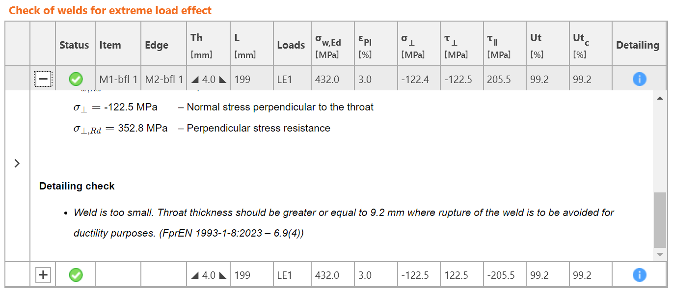 This method modifies weld size to minimum ductility of welded joints as per the Eurocode requirements in FprEN 1993-1-8:2023 – 6.9(4), and it applies to all welds and all different steel grades used in the model. The weld resistance is designed to be high enough to prevent brittle failures in the connection and, at the same time, allow plastification in the connected weld.