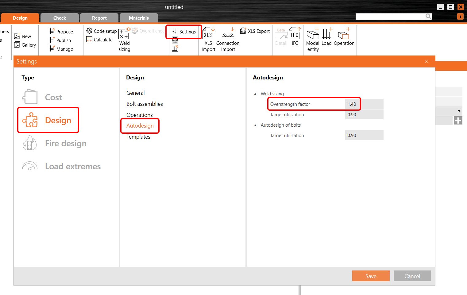 By default, the Overstrength factor is set to 1.4 and can be changed in the project Settings/Design/Autodesign/Overstrength factor.