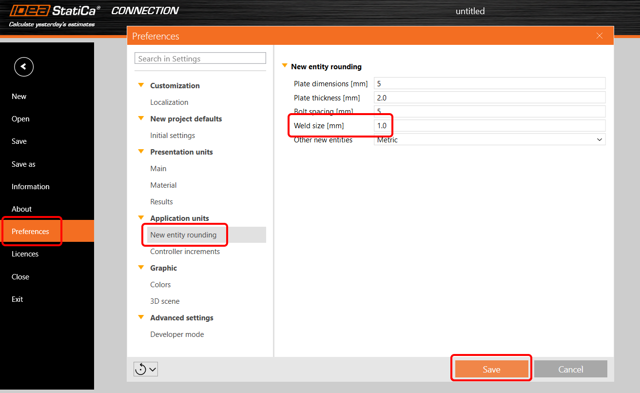Welds size rounding up can be defined in application Preferences/New entity rounding/Weld size.