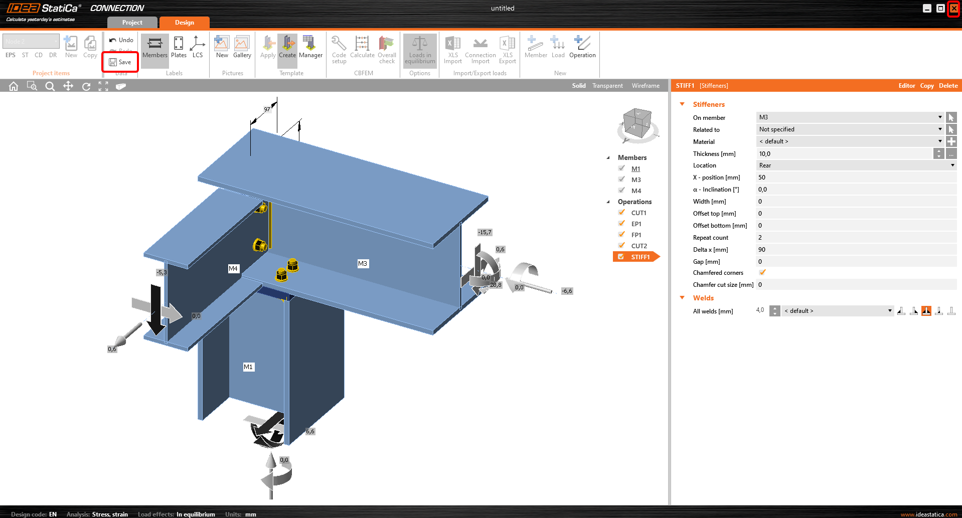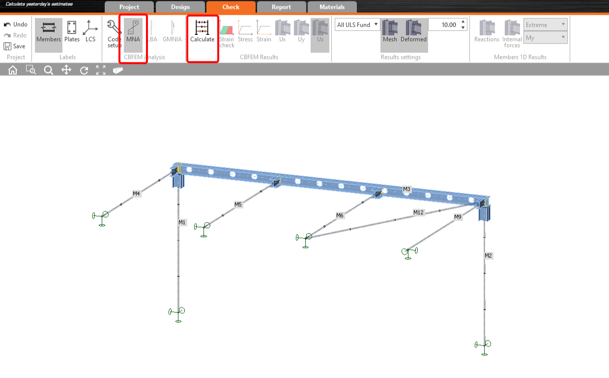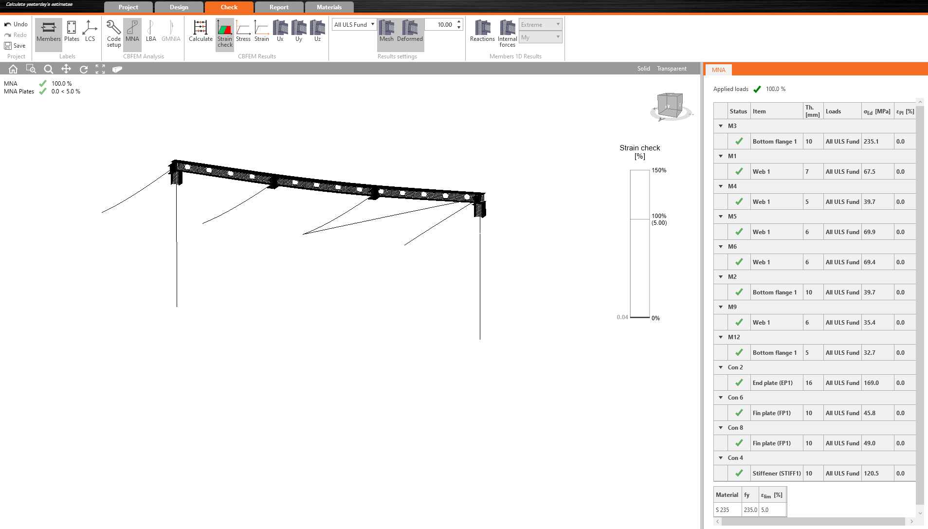 When finishing with the design of all joints, start the linear analysis by clicking on MNA and Calculate in the Tab Check.