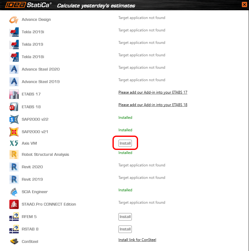 Select your version of AxisVM and click the button Install. The process of integration will start.