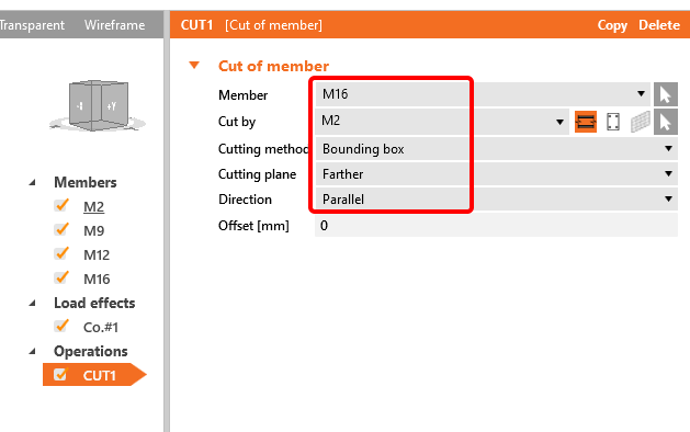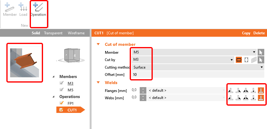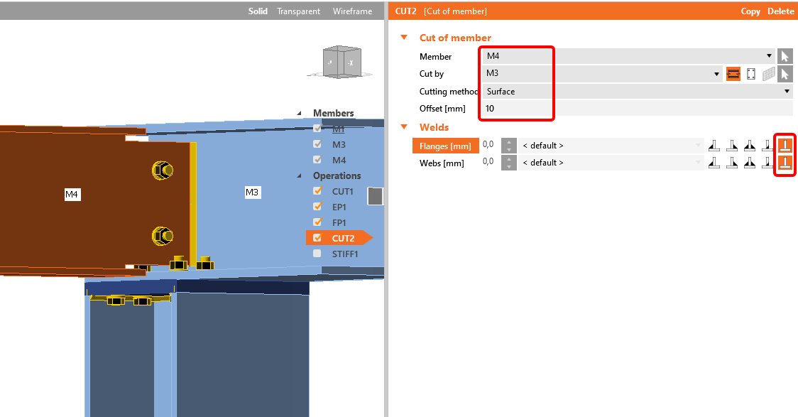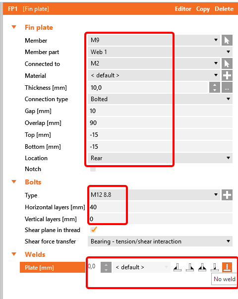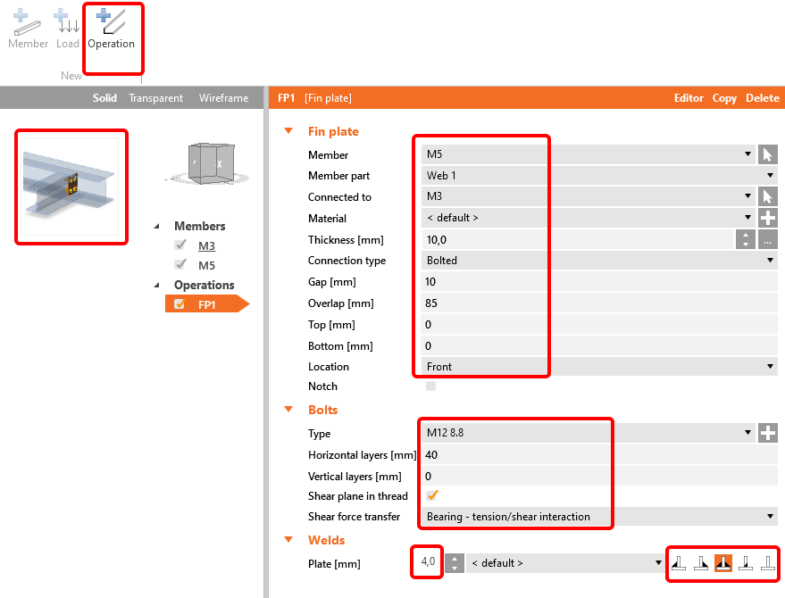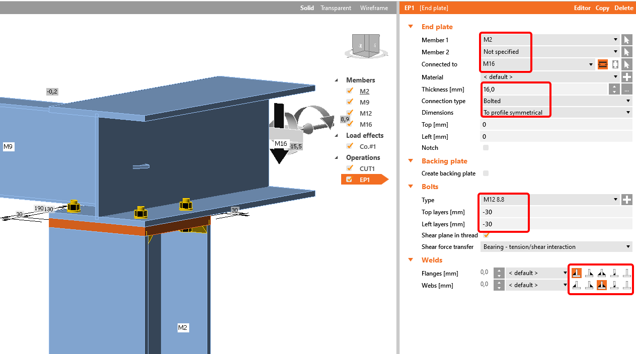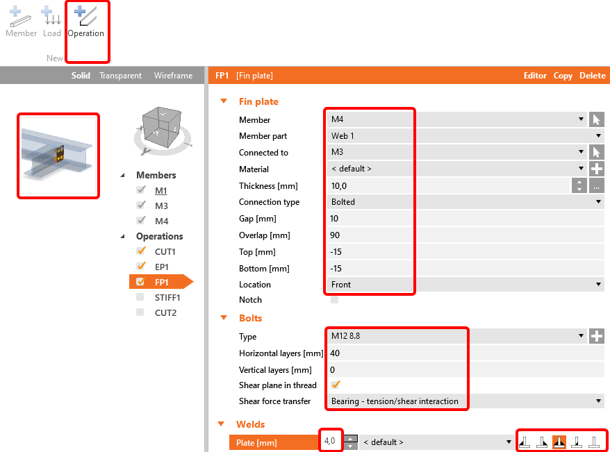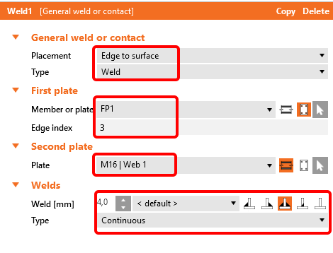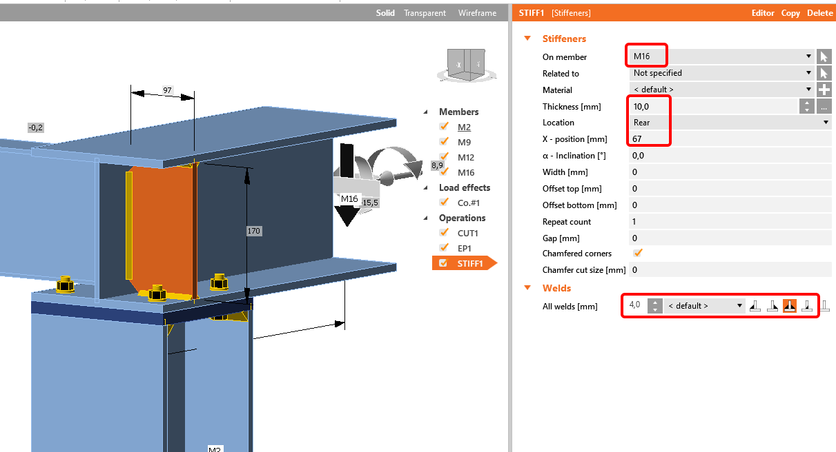 This plate has to be welded to the web of the member M16. So choose the operation Weld and set the values according to the next picture.