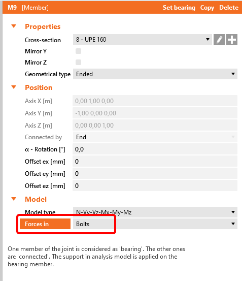 To have a correct position of the loads, select member M9 and change in Model the position of the Forces to Bolts. See more about the correct load position.