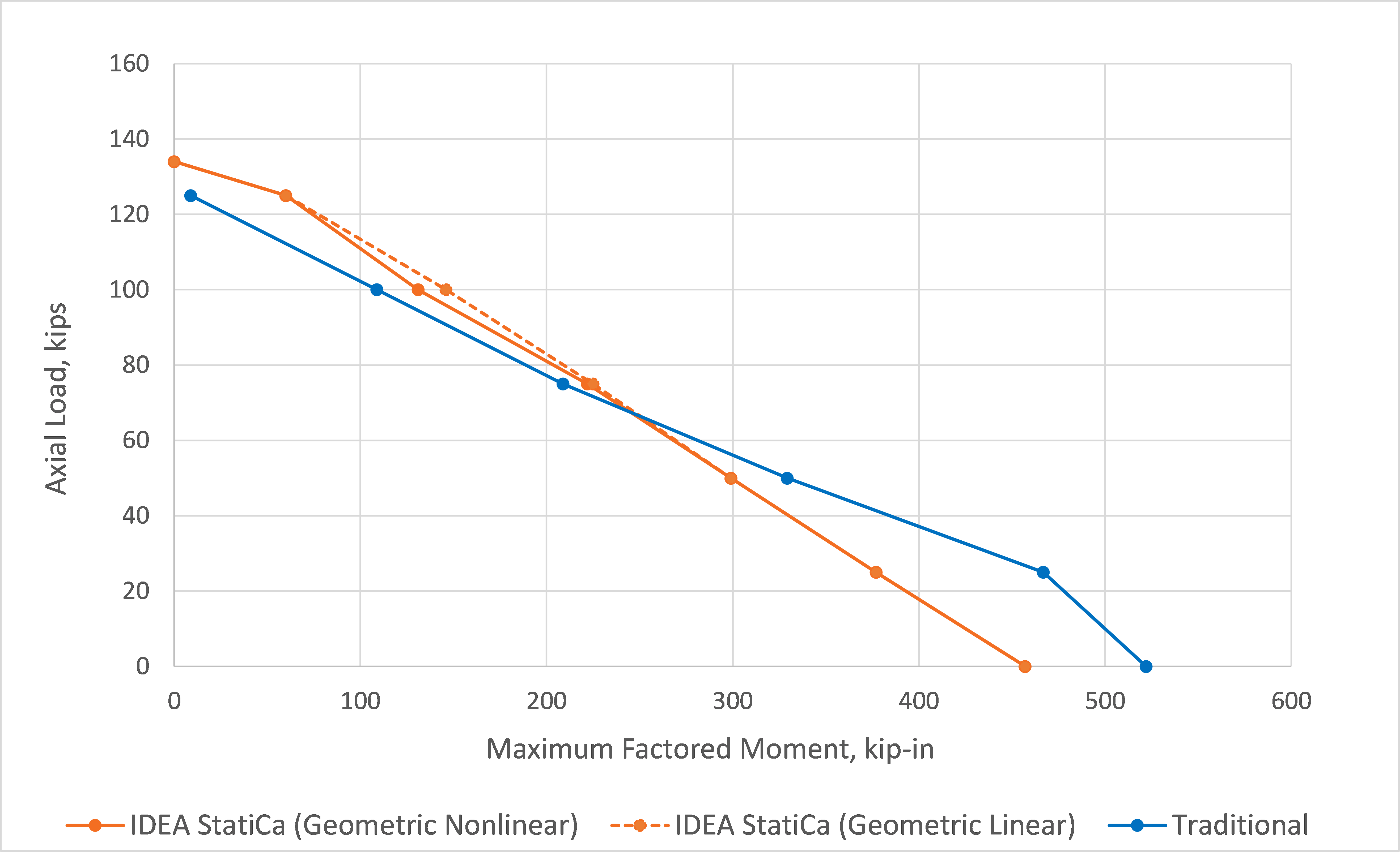 An interaction diagram showing the maximum factored moment for each selected axial load is presented in Fig. 9. The controlling limit state for each analysis is presented in Table 2. Analyses were performed in IDEA StatiCa with geometric nonlinearity on and geometric nonlinearity off. Both sets of results are presented in Fig. 9. For most cases, where the buckling factor limit controlled, there is no difference between the two. Differences were noted for applied axial loads of 75 kips and 100 kips.