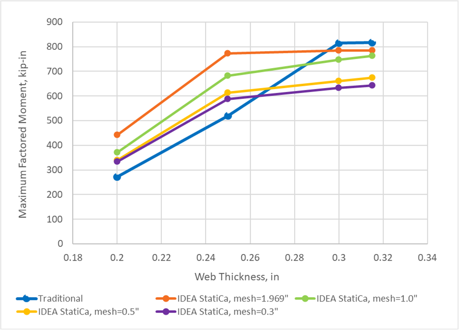 Overall, the results show a significant mesh dependence for this connection. The maximum factored moment capacity decreases as the size of the mesh decreases. Additionally, in some instances, the failure mode changes with the refinement of the mesh. For the connections with web thicknesses of 0.25 in. and 0.30 in., the controlling limit state transitions from exceeding the strain limit in the cap plate at the default mesh size (1.969 in.) to exceeding the strain limit in the beam web for the decreased maximal element sizes. Note that cap plate bending was not expected to occur per the traditional calculations. The maximal element size also impacts the buckling results. For the connection with a beam web thickness of 0.20 in., the buckling factor limit controls. The applied load at which the limit is reached decreases with mesh size and appears to converge at a maximal element size of 0.50 in.