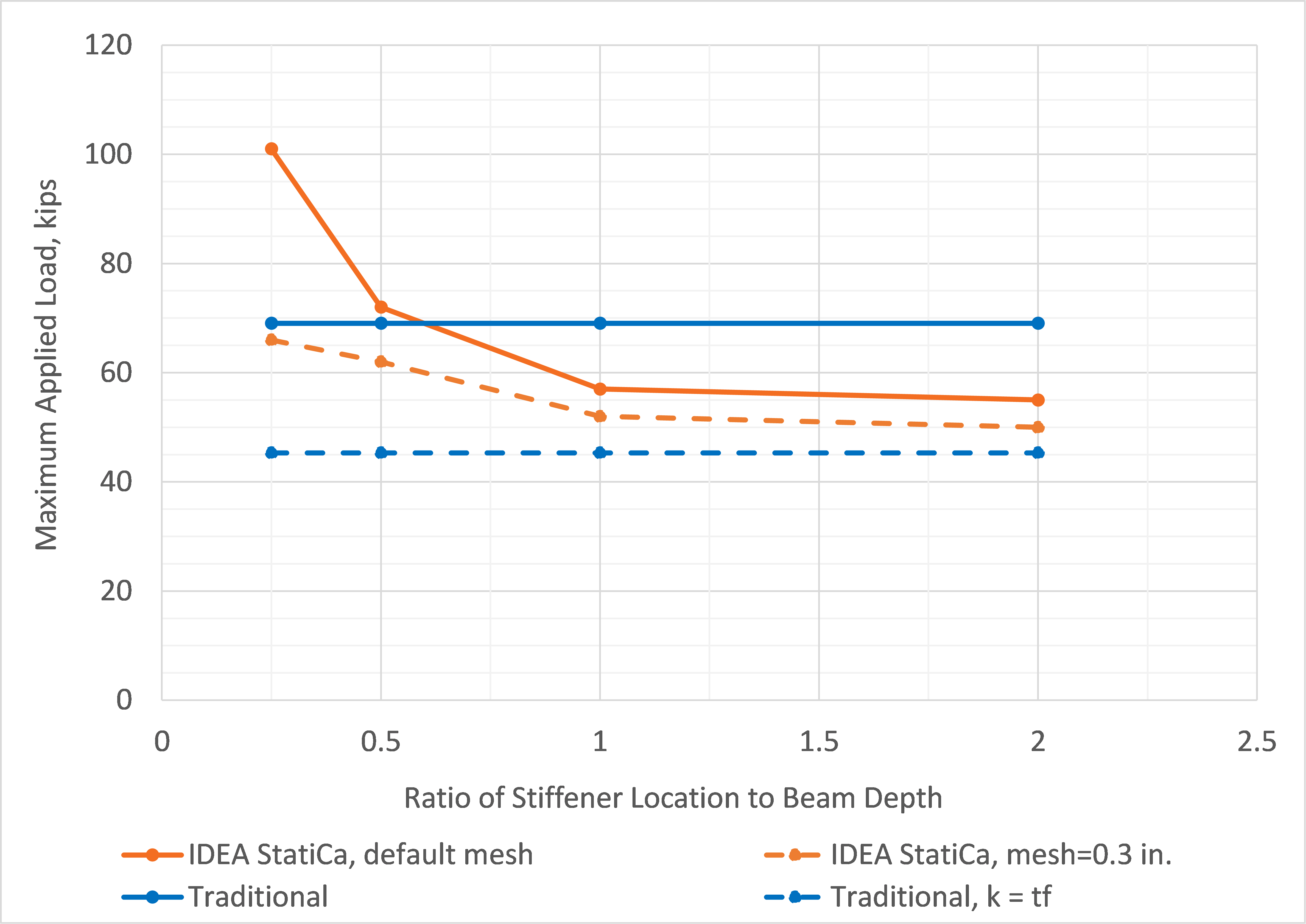 Local web yielding controls for the traditional calculations for all cases. The plastic strain limit controls for IDEA StatiCa for the stiffener located one-quarter the beam depth from the applied load and the buckling limit controls otherwise. For the nearby stiffeners, IDEA StatiCa exhibits a greater strength than the traditional calculations. However, as the distance to the stiffener increases, the strength from IDEA StatiCa reduces, eventually settling below the strength from the traditional calculations. The strength from traditional calculations for k = tf is still lower, but this case is shown for informational purposes and not for direct comparison. Regardless, these results demonstrate that IDEA StatiCa captures the stiffening effect of nearby stiffeners which contributed to the discrepancy in results shown in Fig. 4.