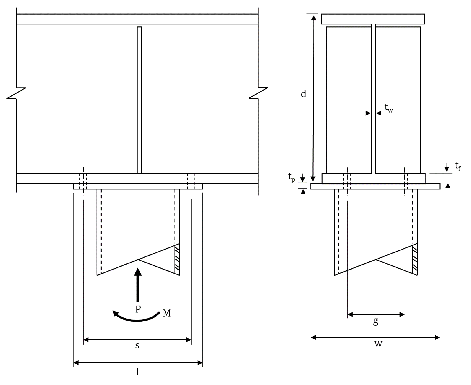 A comparison between results from the component-based finite element method (CBFEM) and traditional calculation methods used in US practice for beam-over-column connections is presented in this section. Connection limit states evaluated include beam web local yielding, beam web local crippling, HSS wall local yielding, HSS wall local crippling, cap plate bending, beam flange bending, and bolt tensile rupture. HSS member strength was also evaluated. A schematic of the beam-over-column connection investigated is presented in Fig. 1.