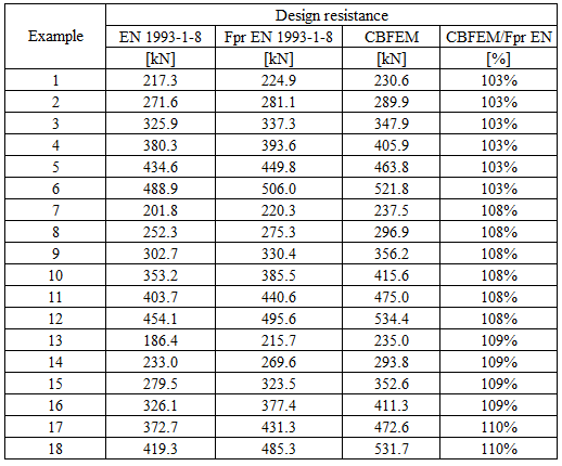 Table 5.6.3 Comparison of results of design resistances predicted by CBFEM, EN 1993-1-8 and Fpr EN 1993-1-8. Effect of bolt pitch