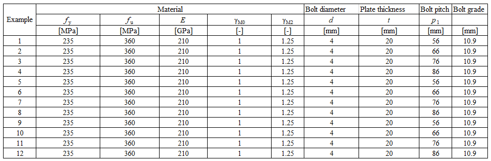 Table 5.6.1 Examples overview. Effect of bolt pitch