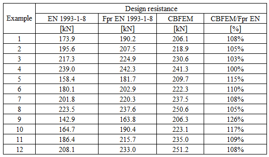 Table 5.6.4 Comparison of results of design resistances predicted by CBFEM, EN 1993-1-8 and Fpr EN 1993-1-8. Effect of plate thickness