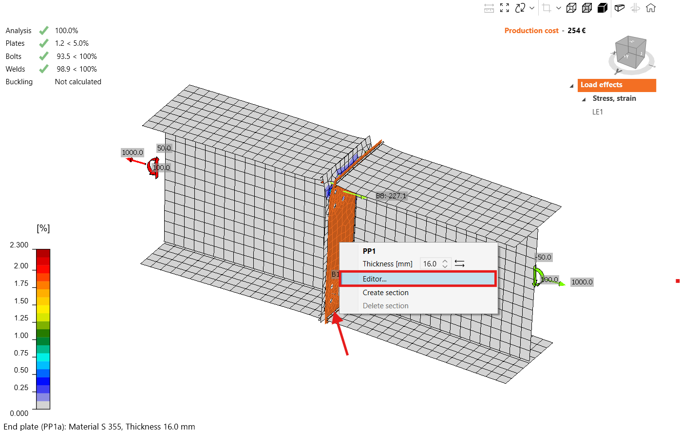 IDEA StatiCa Connection allows easy optimization of the design. You can remove the unnecessary bolts in the plate editor. Right-click on the connecting plate and open the Editor.