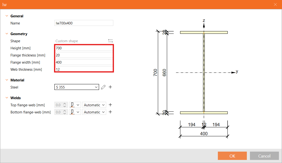 Two beams were automatically added. Change the cross-section of member B1 to a welded I section and define the cross-section dimensions (height, flange thickness, and width and thickness of the web).