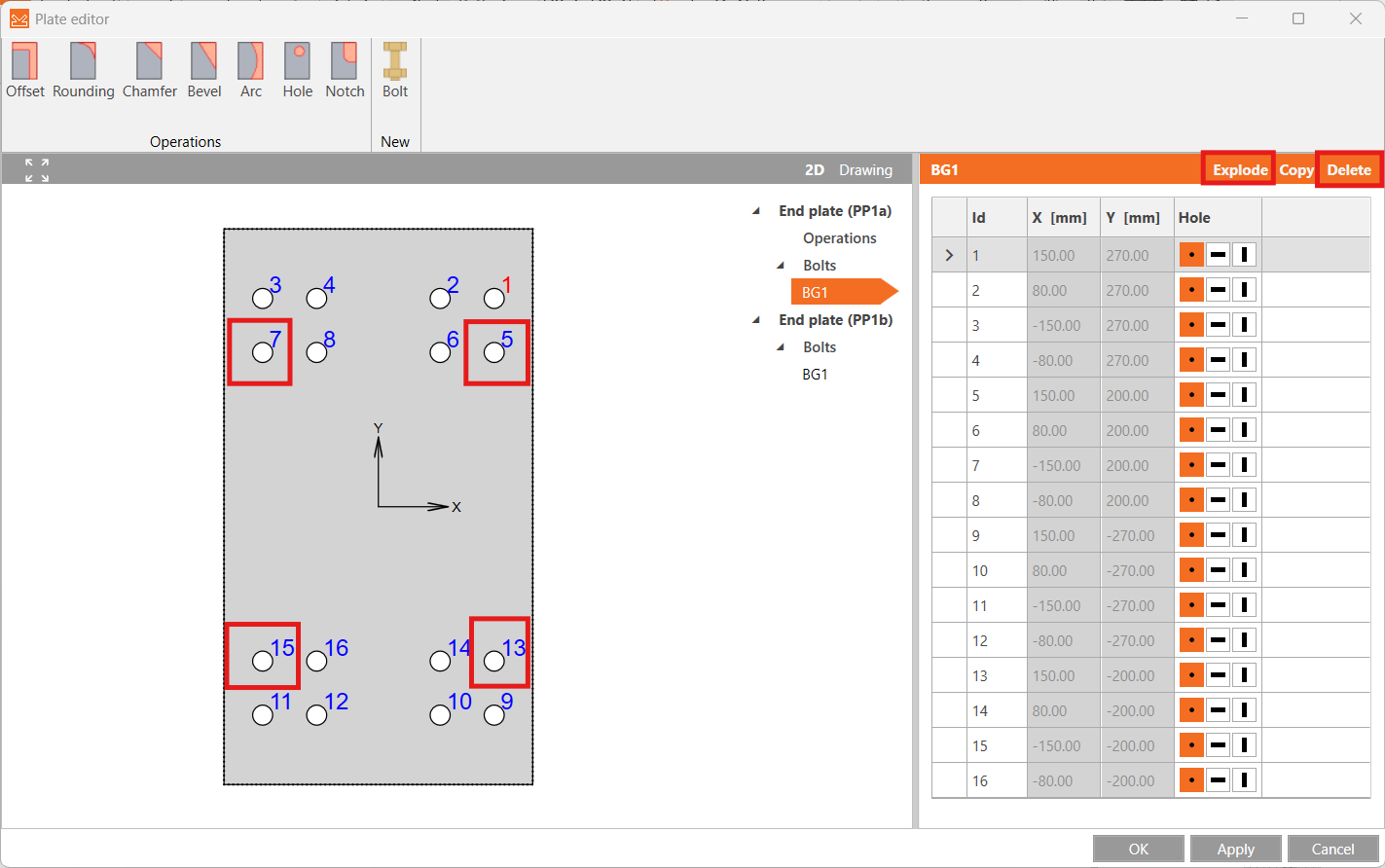 Click Explode above the bolts table and delete the unnecessary bolts 5, 7, 13, and 15.