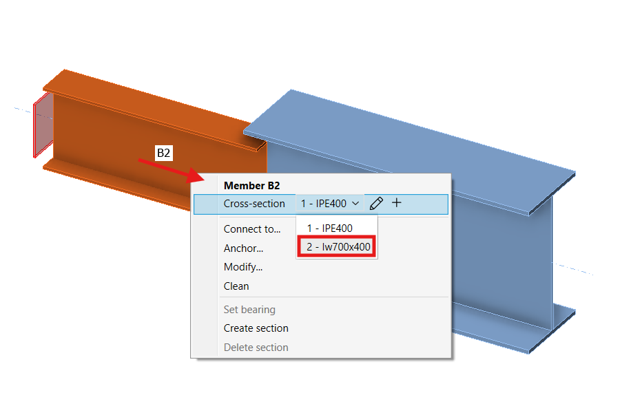 Assign the same cross-section to member B2. You can use the right-click menu in the 3D scene or the drop-down menu in the parameters tab.