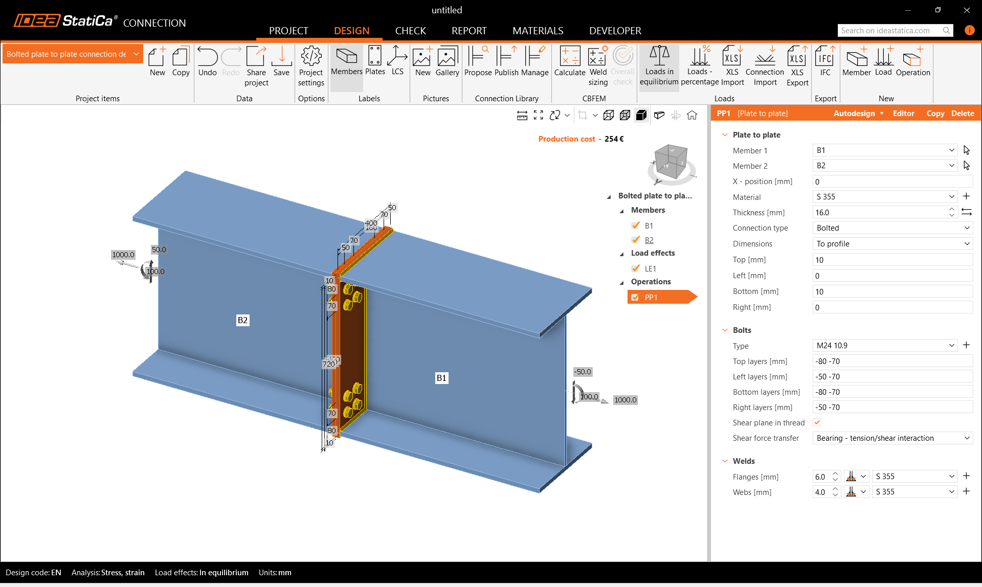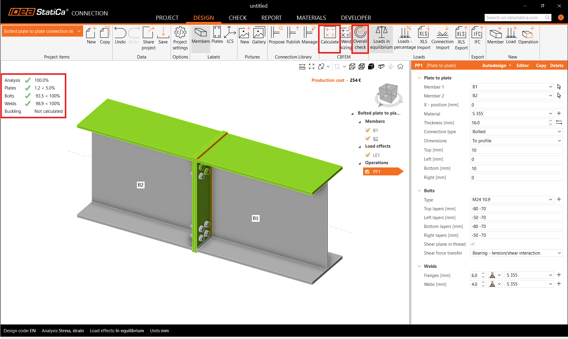 You have designed, optimized, and code-checked a bolted plate-to-plate connection according to Eurocode (EN).