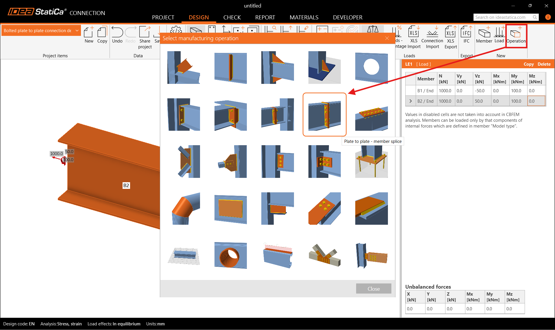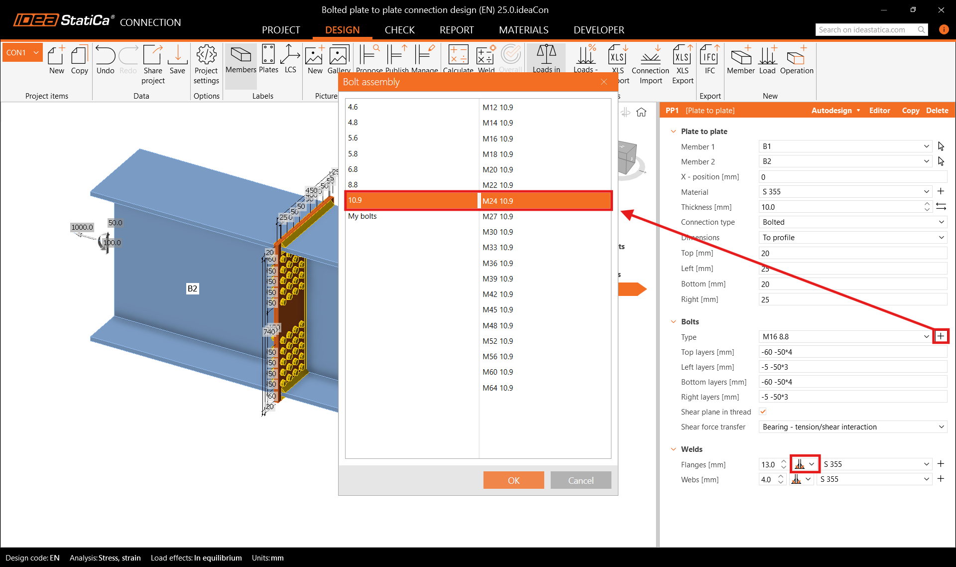 First add the manufacturing operation Plate to plate - member splice. Modify the thickness and dimensions of the plate. Adjust the bolt type to M24 10.9.