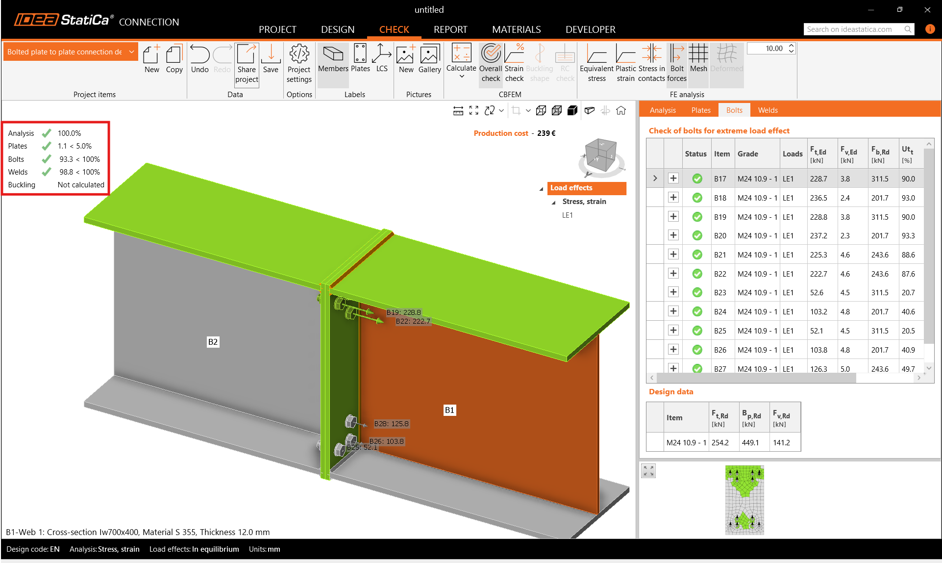 Start the analysis based on CBFEM by clicking Calculate in the ribbon. The analysis model is automatically generated, the calculation is performed and you can directly see the overall check results in the top-left corner of the scene.